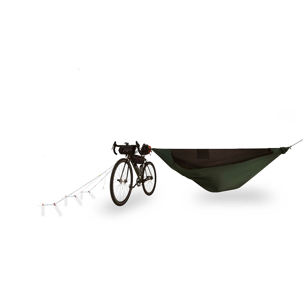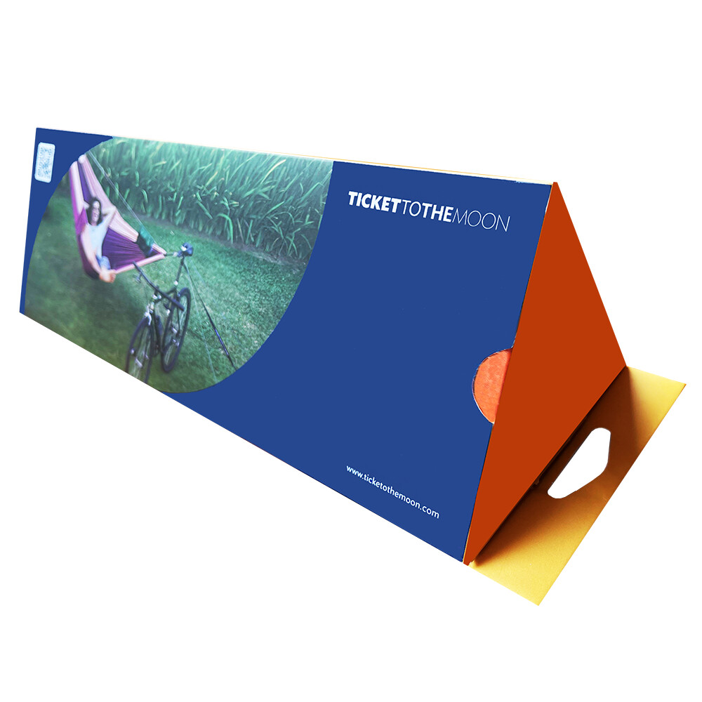 Dzięki zestawowi Ticket To The Moon 2nd TREE KIT nie potrzebujesz już drugiego drzewa na swój hamak! Ten innowacyjny zestaw umożliwia bezpieczne zawieszenie hamaka na jednym drzewie, rowerze lub innym punkcie zaczepienia. Wystarczy umieścić kołki i przymocować do roweru. Działa również z kijkami trekkingowymi lub motocyklami. Bezpieczne mocowanie dzięki trójkątnemu układowi.