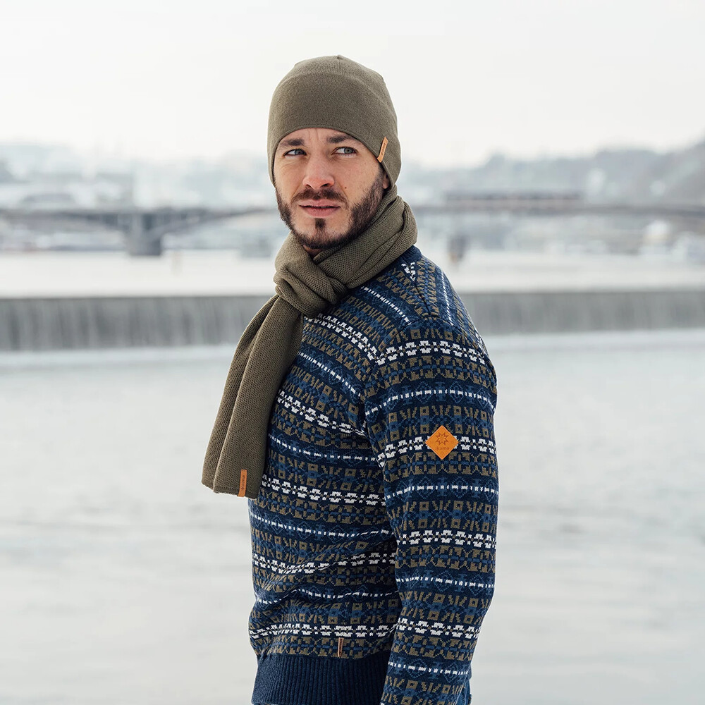 Zimowa czapka z dzianiny Kama z motywem górskim.