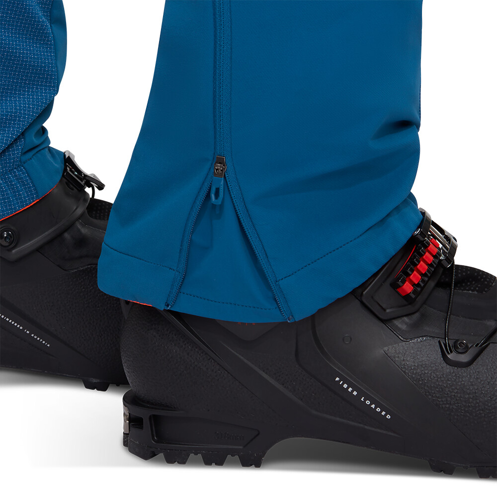 Lekki elastyczny materiał jest wysoce oddychający, a podwójnie tkany materiał softshell jest wiatroszczelny. Panele z tyłu ud i w okolicy kolan zapewniają doskonałe odprowadzanie wilgoci i swobodę ruchów. Boczny zamek błyskawiczny umożliwia regulację temperatury podczas bardziej intensywnej aktywności. Elastyczna talia ze sznurkiem zapewnia doskonałe dopasowanie. Boczne kieszenie na suwak pomieszczą wszystko, czego potrzebujesz. Asymetrycznie ukształtowany dół nogawek jest kompatybilny z butami wspinaczkowymi. Wzmocnienia chronią nogi przed krawędziami nart lub rakami.