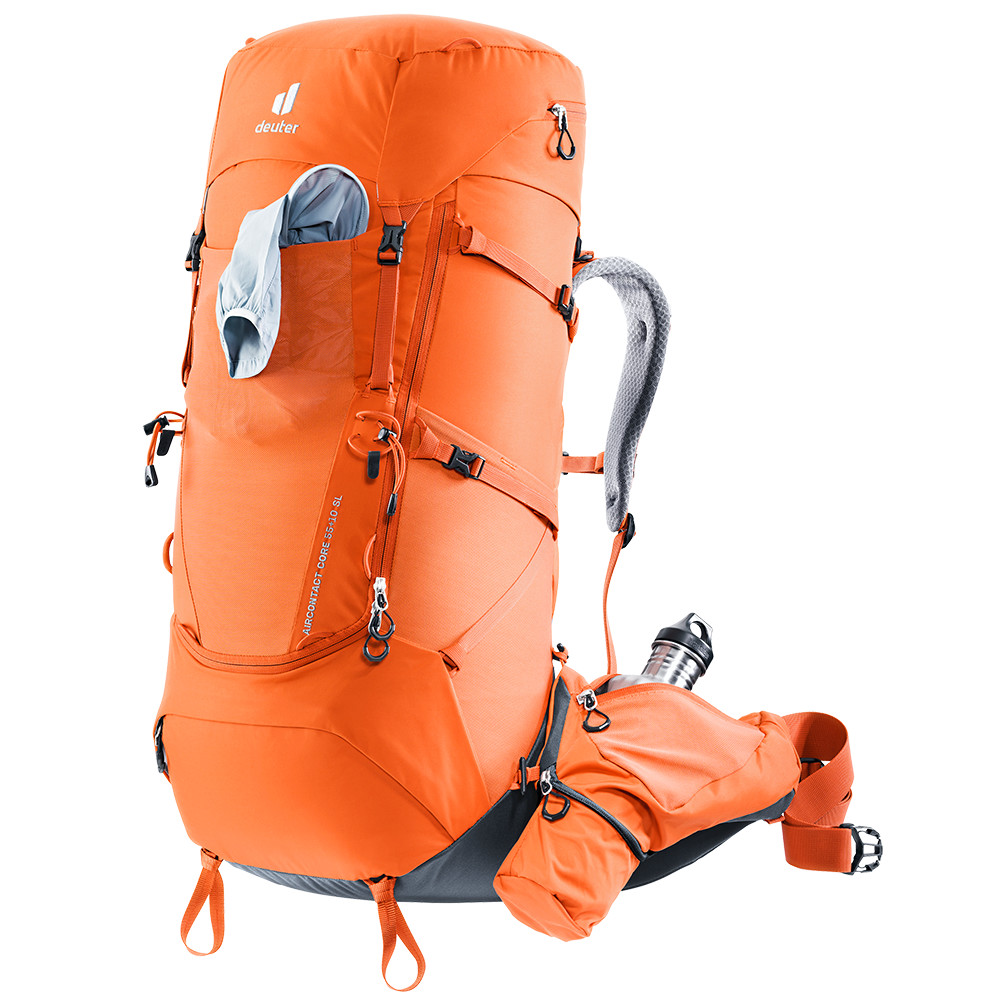 Damska wersja plecaka Aircontact Core firmy deuter zadowoli każdą podróżniczkę, nomadkę lub entuzjastkę trekkingu. Jego rozmiar jest odpowiedni, aby pomieścić niezbędne rzeczy, od szortów lub spódnic po ocieplane spodnie. Jeśli to nie wystarczy, wystarczy powiększyć go nawet o 10 litrów, użyć pasków do przymocowania przyczepy kempingowej lub hamaka lub dwóch trzylitrowych wyjmowanych kieszeni na pasie biodrowym. Tam również można przechowywać niezbędne drobiazgi, takie jak baton energetyczny. W prawej kieszeni znajduje się również 1,5-litrowy rękaw na butelkę, dzięki czemu można do niego sięgnąć, gdy opróżnia się plecak hydracyjny.