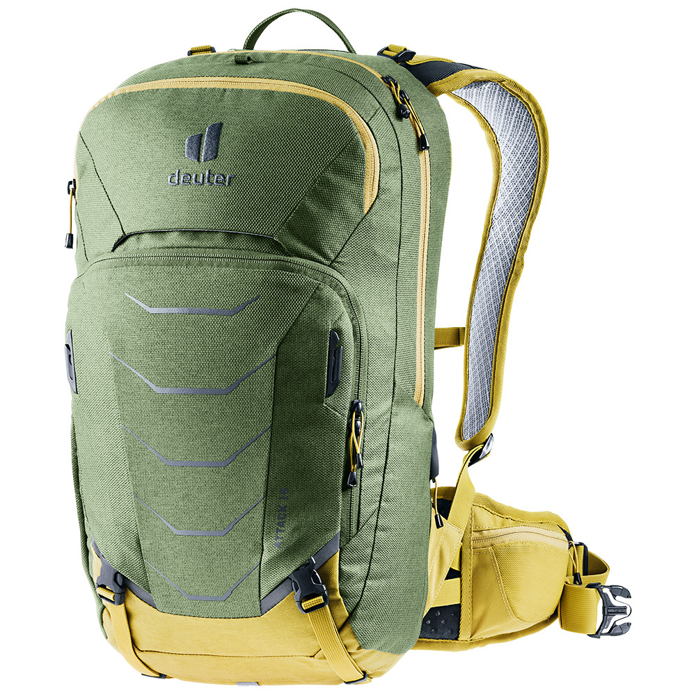 Plecak rowerowy deuter wykonany z wytrzymałych materiałów i gotowy do drogi. Attack nadaje się na wycieczki rowerowe w trudnym terenie, dlatego z tyłu znajduje się ochraniacz kręgosłupa. Ochraniacz przeszedł certyfikację TÜV i jest wyjmowany.