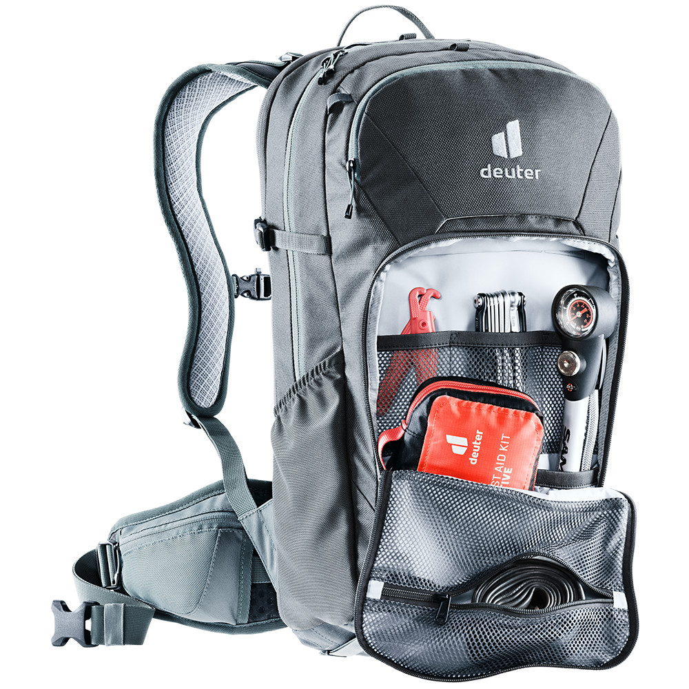 Plecak rowerowy deuter dla wysportowanych rowerzystów, wykonany z wytrzymałych materiałów i gotowy do drogi. Attack nadaje się na wycieczki rowerowe w trudnym terenie, dlatego z tyłu znajduje się ochraniacz kręgosłupa. Ochraniacz przeszedł certyfikację TÜV i jest wyjmowany.