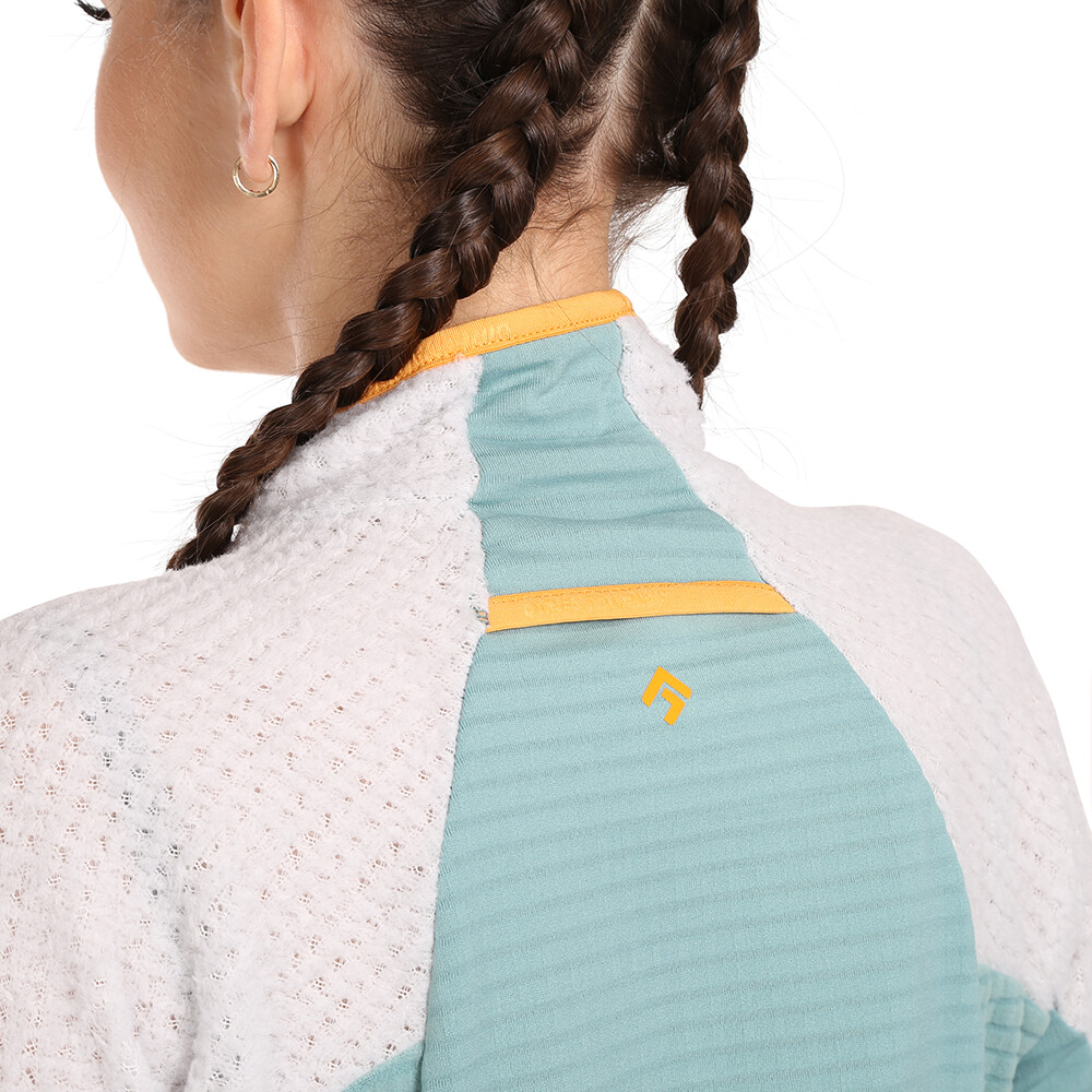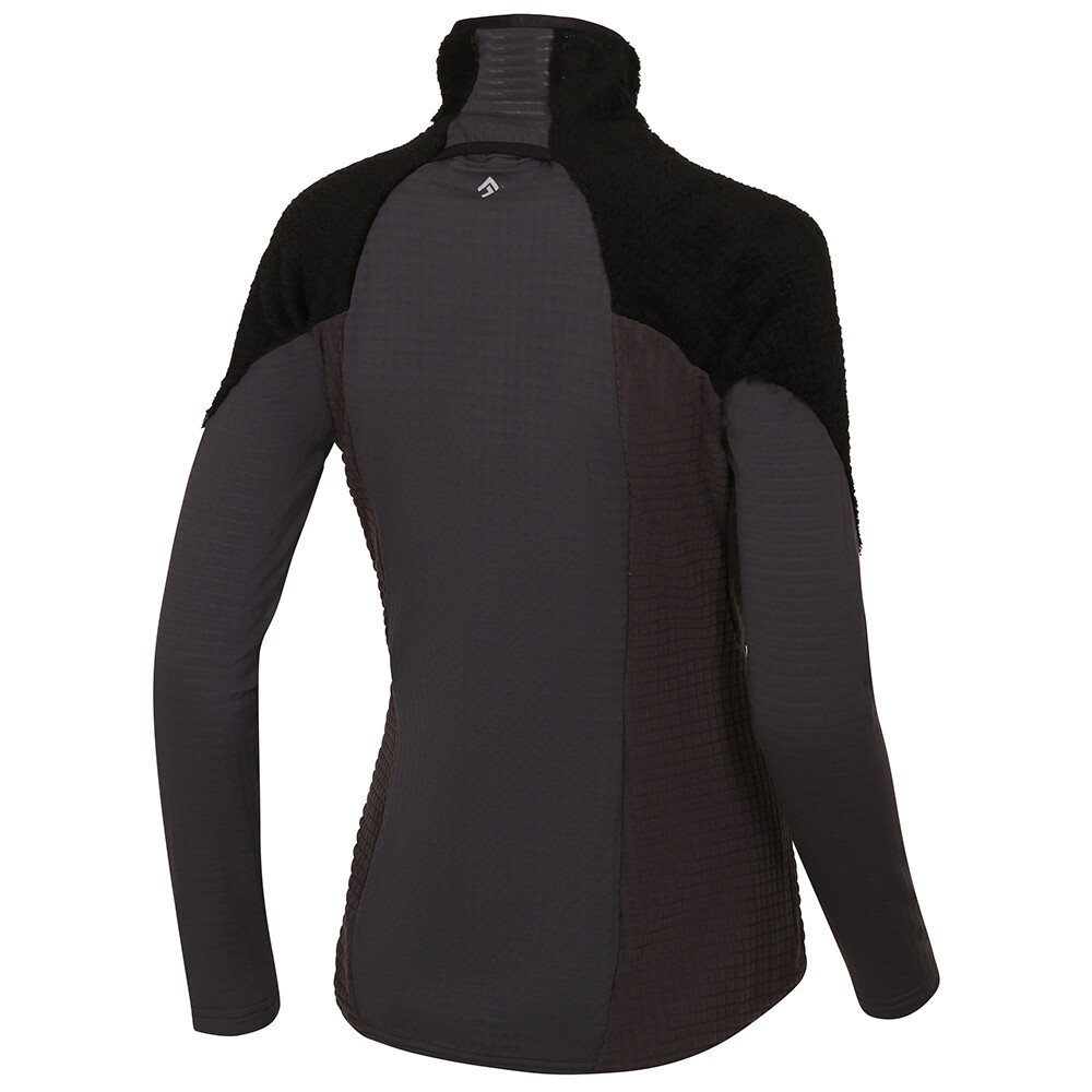 W górnej części tułowia zastosowano popularny Polartec® Alpha, który może zatrzymać niezbędne ciepło. W dolnej części znajduje się bardzo lekki, elastyczny i oddychający Technostretch Grid Fleece, który aktywnie odprowadza nadmiar wilgoci. Bluza ma głęboki zamek błyskawiczny, raglanowe rękawy dla wygodniejszej mobilności ramion i przedłużony tył, aby odpowiednio zakryć obszar pleców.
