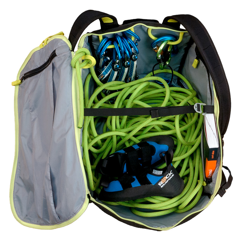 Plecak Beetle Bag II od Rock Empire został zaprojektowany jako kompromis pomiędzy plecakiem wspinaczkowym, ale nadaje się również do pracy. W pełni odpinany tył, który zawsze znajduje się na górze, gdy plecak jest umieszczony na ziemi, zapobiega zabrudzeniu ubrań przez kurz pod skałami. Kompaktowy rozmiar z wyglądu, ale o pojemności 80-100 Rm (metrów liny) plus sprzęt wspinaczkowy na trasy sportowe.