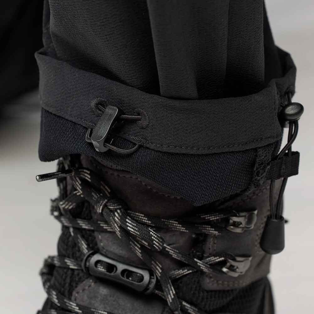 Spodnie te zostały wykonane z poliamidu zapewniającego dodatkową wytrzymałość oraz elastanu. Ta kombinacja daje nam 4-kierunkową rozciągliwość dla odpowiedniego komfortu i nieograniczonego ruchu podczas podróży. Materiał chroni również przed wiatrem. Talia spodni jest regulowana za pomocą paska z klamrą. Kieszenie na dłonie są zapinane na zamek błyskawiczny, dzięki czemu żadne przechowywane małe przedmioty nie wypadną podczas ruchu. Pozostałe kieszenie znajdują się na nogawkach, również zapinane na zamek. Dodatkowo, dzięki wewnętrznemu materiałowi, mogą służyć jako otwory wentylacyjne. Spodnie są wyposażone w haczyk na sznurowadło u dołu, dzięki czemu można je przymocować do buta.