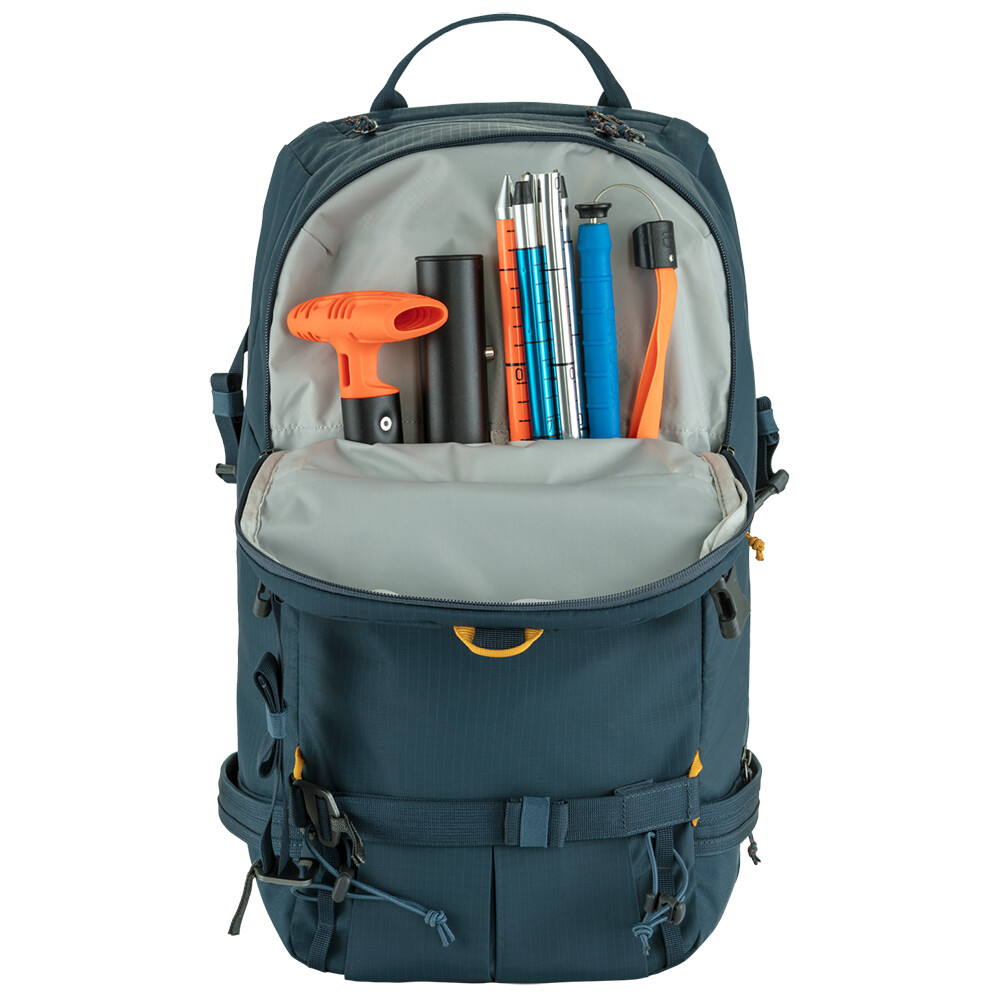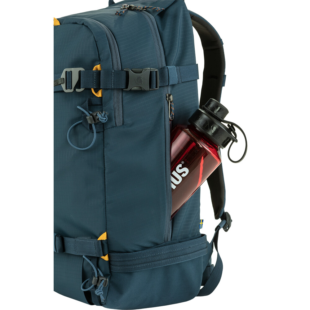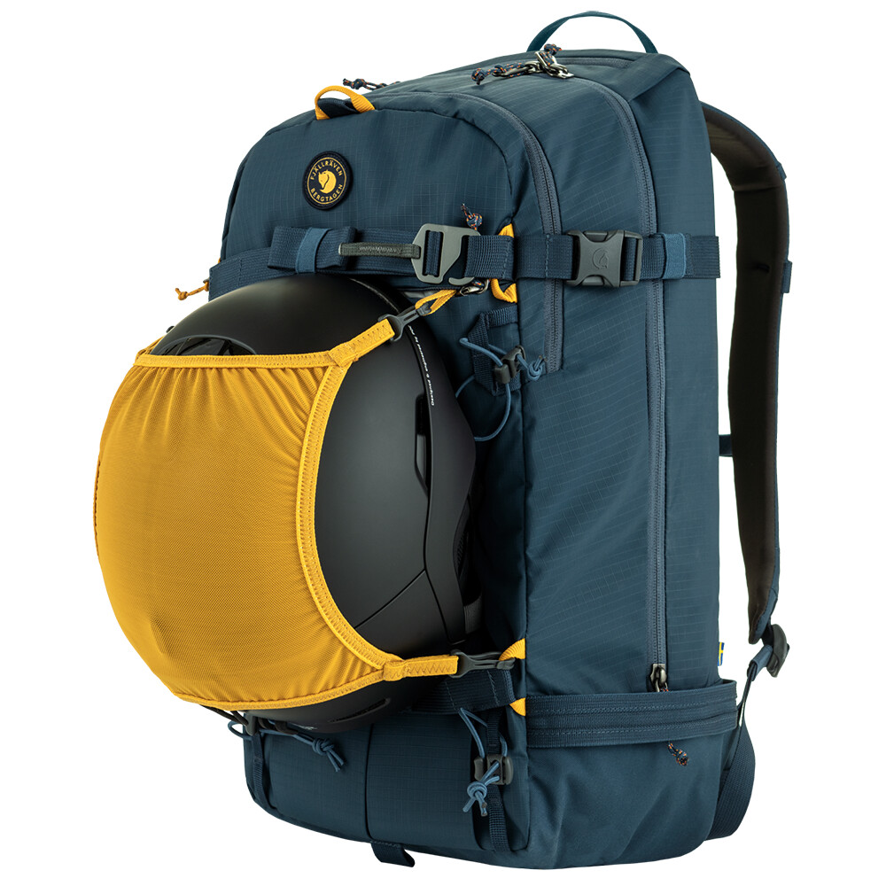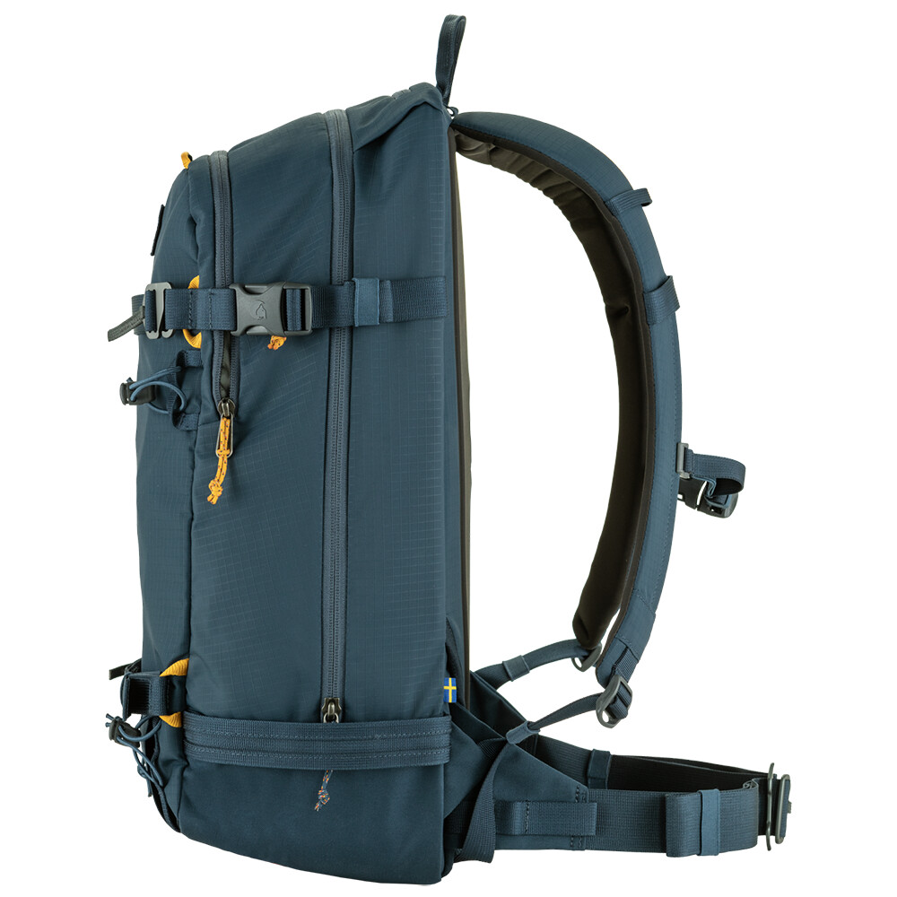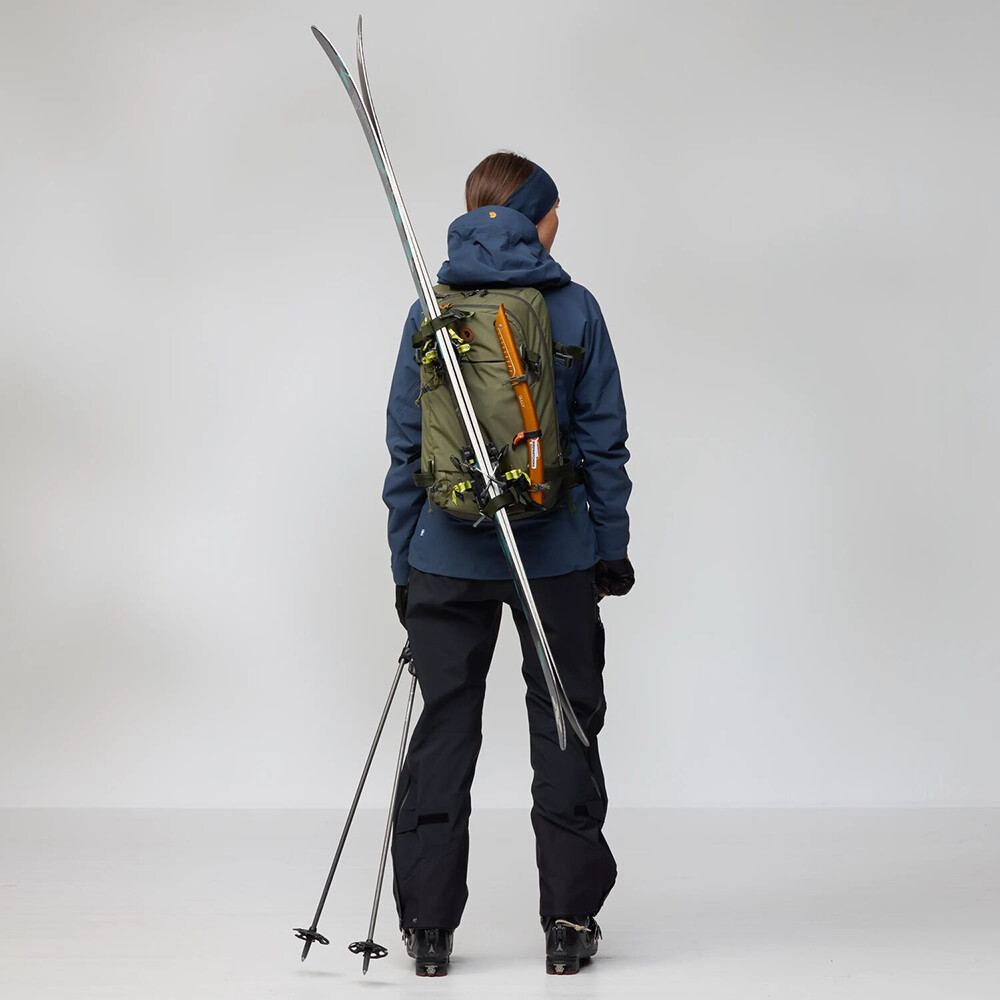 Wyposaż się w plecak Fjällräven na zimowe wyprawy w góry, ski touring lub freeride. Plecak ma mniejszą pojemność 22 litrów, dzięki czemu nadaje się na krótsze wędrówki i zjazdy. Główna kieszeń ma długi zamek błyskawiczny z trzema suwakami, dzięki czemu można szybko i łatwo znaleźć potrzebny sprzęt, nawet w grubych zimowych rękawiczkach. Oczywiście jest osobna kieszeń na sprzęt lawinowy (łopatę, sondę), możliwość przenoszenia nart lub snowboardu, pętle do mocowania czekanów i kijków oraz odpinany uchwyt na kask. Pas biodrowy jest wyposażony w elastyczną kieszeń zapinaną na zamek, metalową klamrę i pętle na materiał wspinaczkowy.
