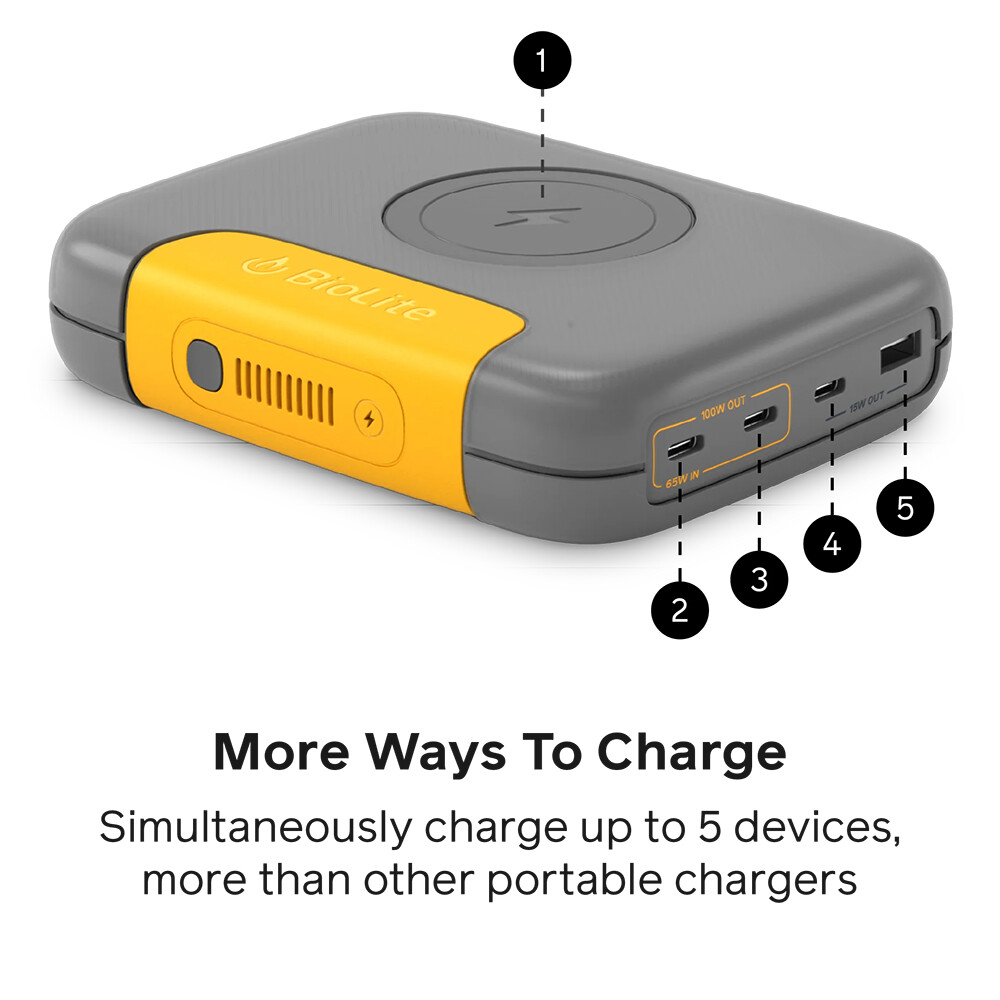 Ładowarka Charge 100 Max od BioLite została zaprojektowana do szybkiego ładowania dowolnej elektroniki osobistej. Dzięki dużej pojemności poradzi sobie ze wszystkim, od telefonu komórkowego i czołówki po tablet czy laptop. Może również zasilać wiele urządzeń jednocześnie, a dużą zaletą jest opcja ładowania bezprzewodowego. Posiada wejście USB C-PD (power delivery) dla maksymalnej prędkości ładowania i ma trzy wyjścia (USB A, USB-C i USB C-PD).