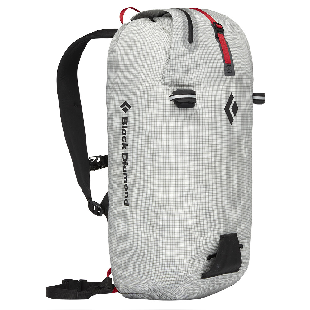 Plecak wspinaczkowy z bocznym zamkiem błyskawicznym na całej długości dla łatwego dostępu, formowanym termicznie panelem tylnym, paskiem na linę i rolowanym mocowaniem, które może służyć jako mocowanie kasku.