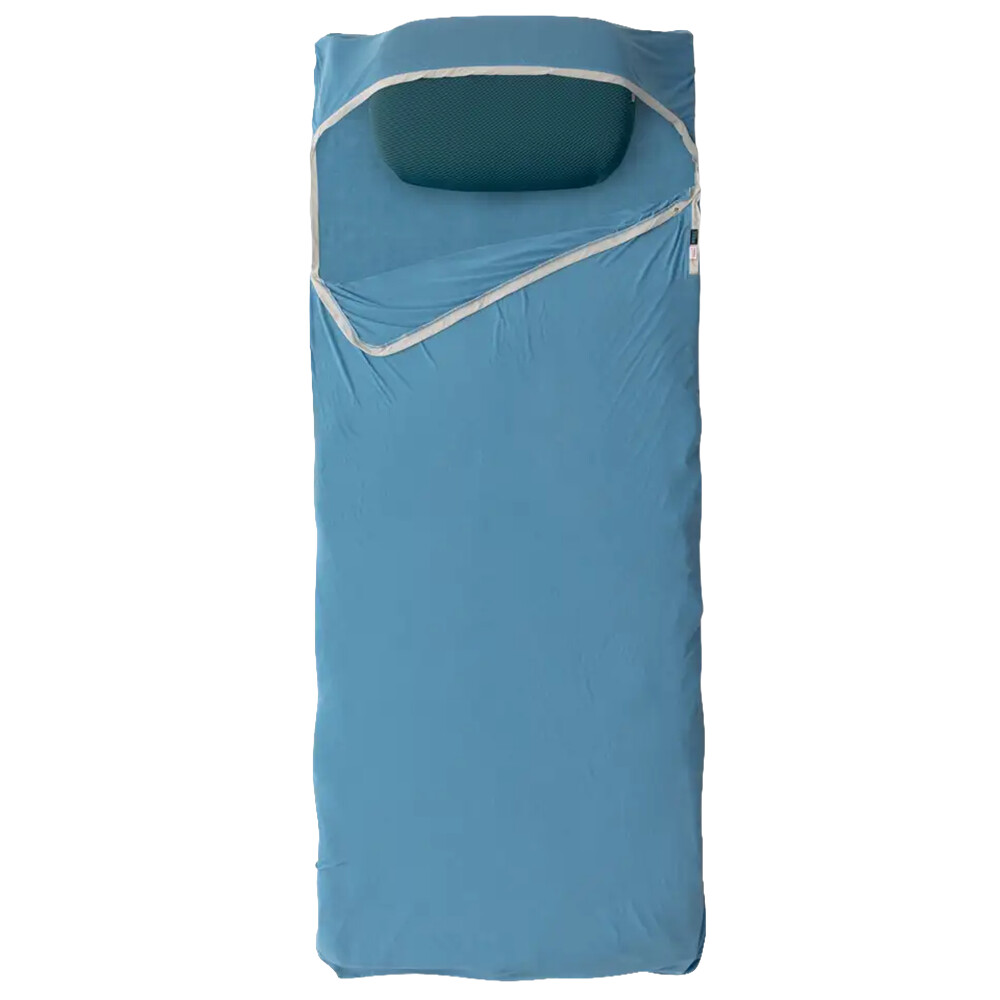 Prostokątna wkładka do śpiwora wykonana z syntetycznego włókna odprowadzającego wilgoć. Kaptur jest wyposażony w kieszeń na poduszkę.