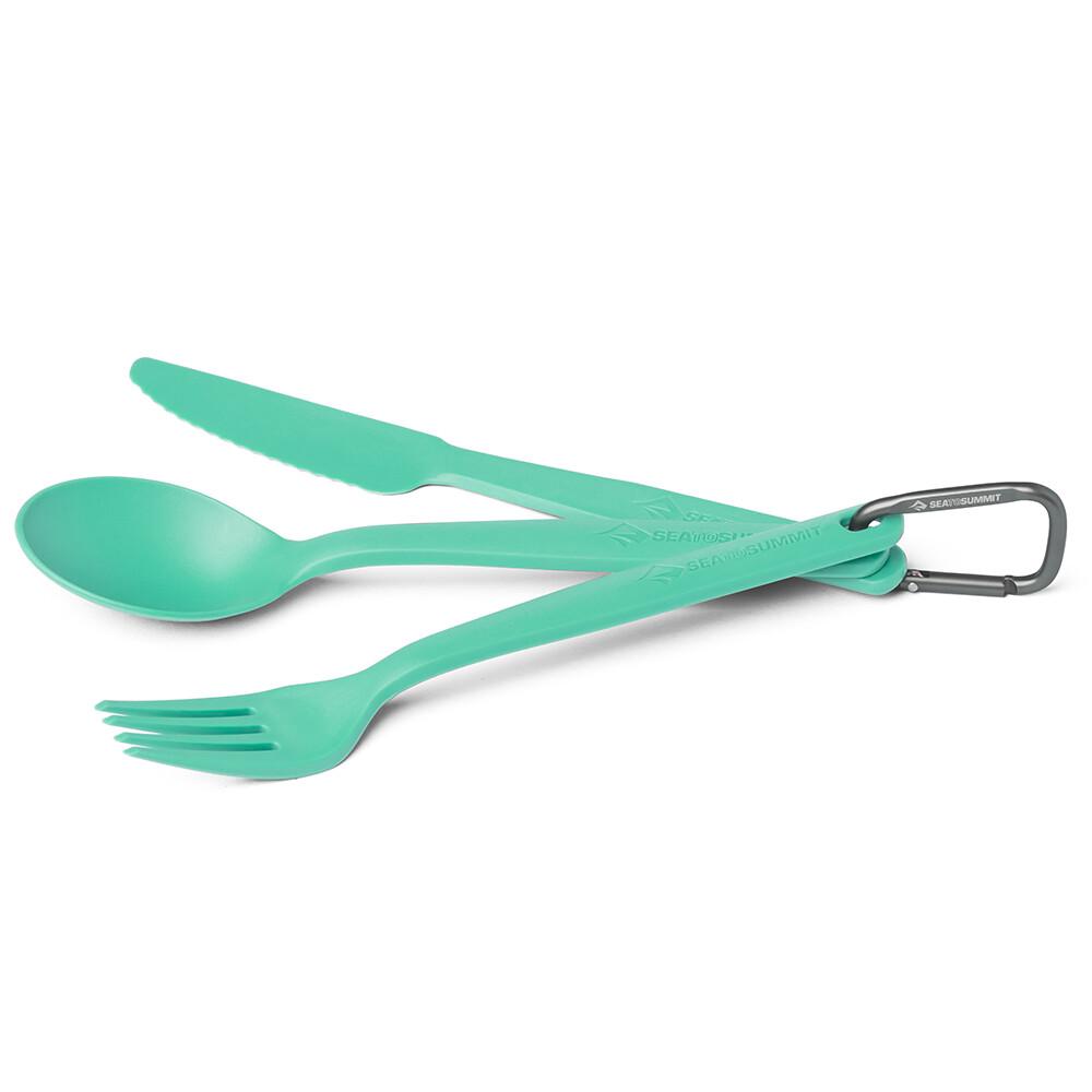 Kompletny zestaw sztućców kempingowych od Sea to Summit wykonany z lekkiego polipropylenu wolnego od BPA. Zawiera łyżkę, widelec i nóż. W zestawie znajduje się również mały karabińczyk do połączenia całego zestawu i zawieszenia go np. na plecaku lub uchwycie garnka.