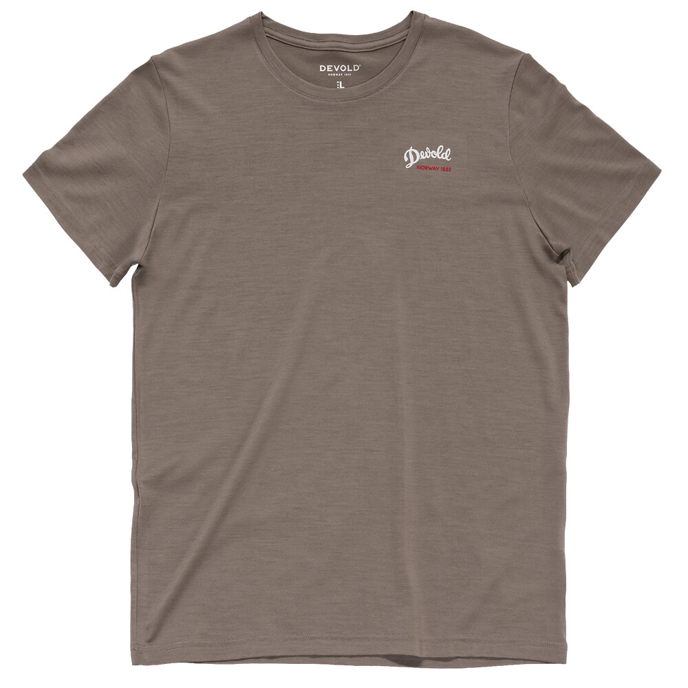 Męska koszulka premium merino Woodworker Tee norweskiej firmy Devold z grafiką na plecach. Wygodna i komfortowa, niezależnie od tego, czy nosisz ją do jogi, jazdy na rolkach, pracy czy podróży.
