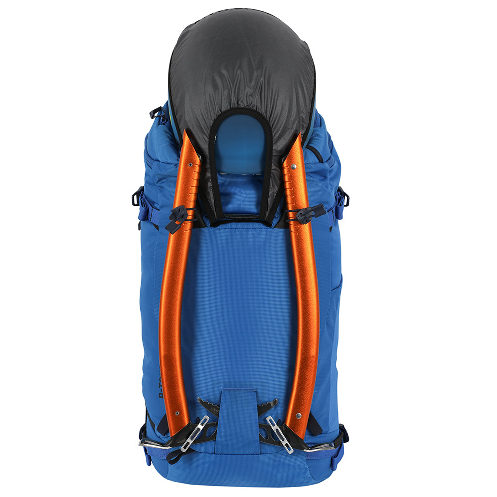 Plecak narciarski z rolowanym zamknięciem i bocznym zamkiem błyskawicznym na całej długości. Możliwość noszenia nart z boku lub po przekątnej, pętle na czekany, kijki i uchwyt na kask. Kieszeń na butelkę na pasku na ramię.