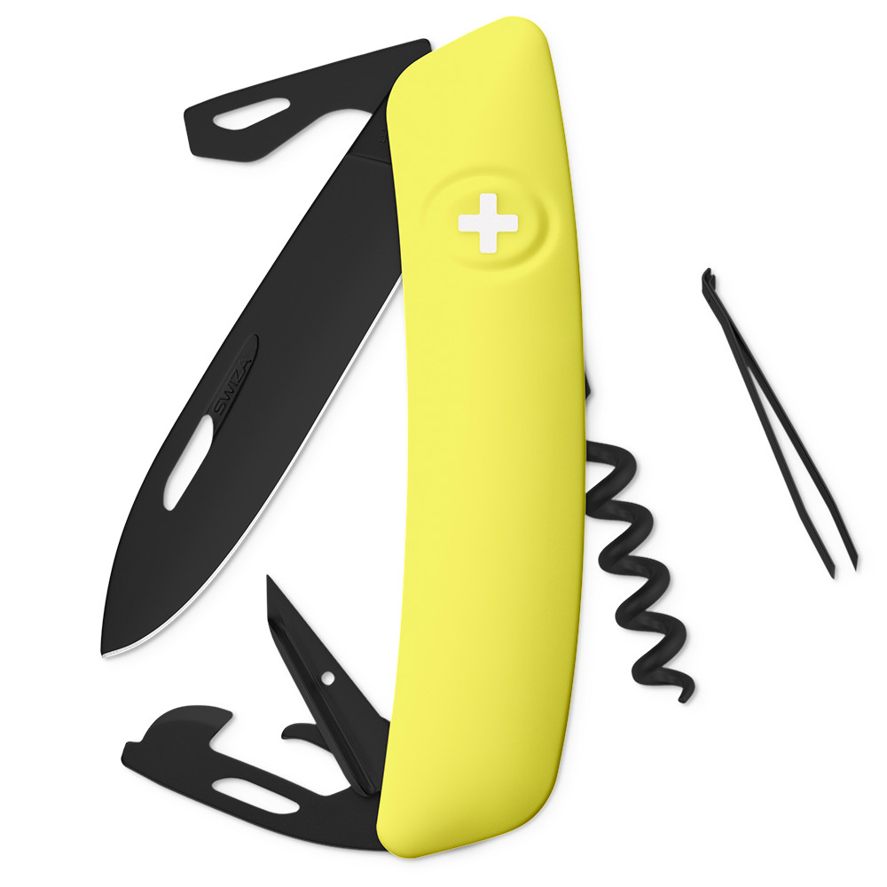 Scyzoryk o długości 95 mm z czernionym ostrzem ze stali nierdzewnej. Czernienie wykonano metodą PVD, dzięki czemu ostrze jest odporne na korozję, ścieranie i wysokie temperatury. Gwóźdź na ostrzu umożliwia łatwe otwieranie noża prawą lub lewą ręką. Bezpieczeństwo jest zintegrowane bezpośrednio z ostrzem i jest aktywowane przez naciśnięcie logo SWIZA. Ergonomicznie zakrzywiony kształt noża umożliwia lepszy i łatwiejszy dostęp do narzędzi. Dodatkowo metalowy pierścień do zawieszania.