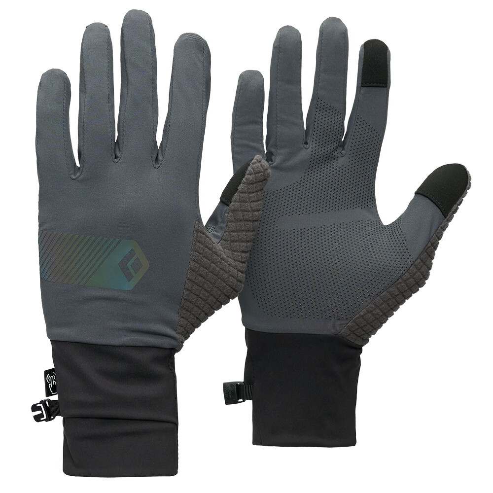 Lekkie oddychające rękawiczki polarowe Deploy Gloves amerykańskiej firmy Black Diamond. Przeznaczone do biegania, jazdy na rowerze i turystyki pieszej. Rękawice mają palec wskazujący i kciuk kompatybilne z ekranami dotykowymi, a nadgarstek ma otwór na zegarek. Sekcja kciuka ma przyjemny polar w kratkę do wycierania nosa. Dłoń pokryta jest silikonowym nadrukiem dla zwiększenia trwałości i lepszej przyczepności, np. z kijami.