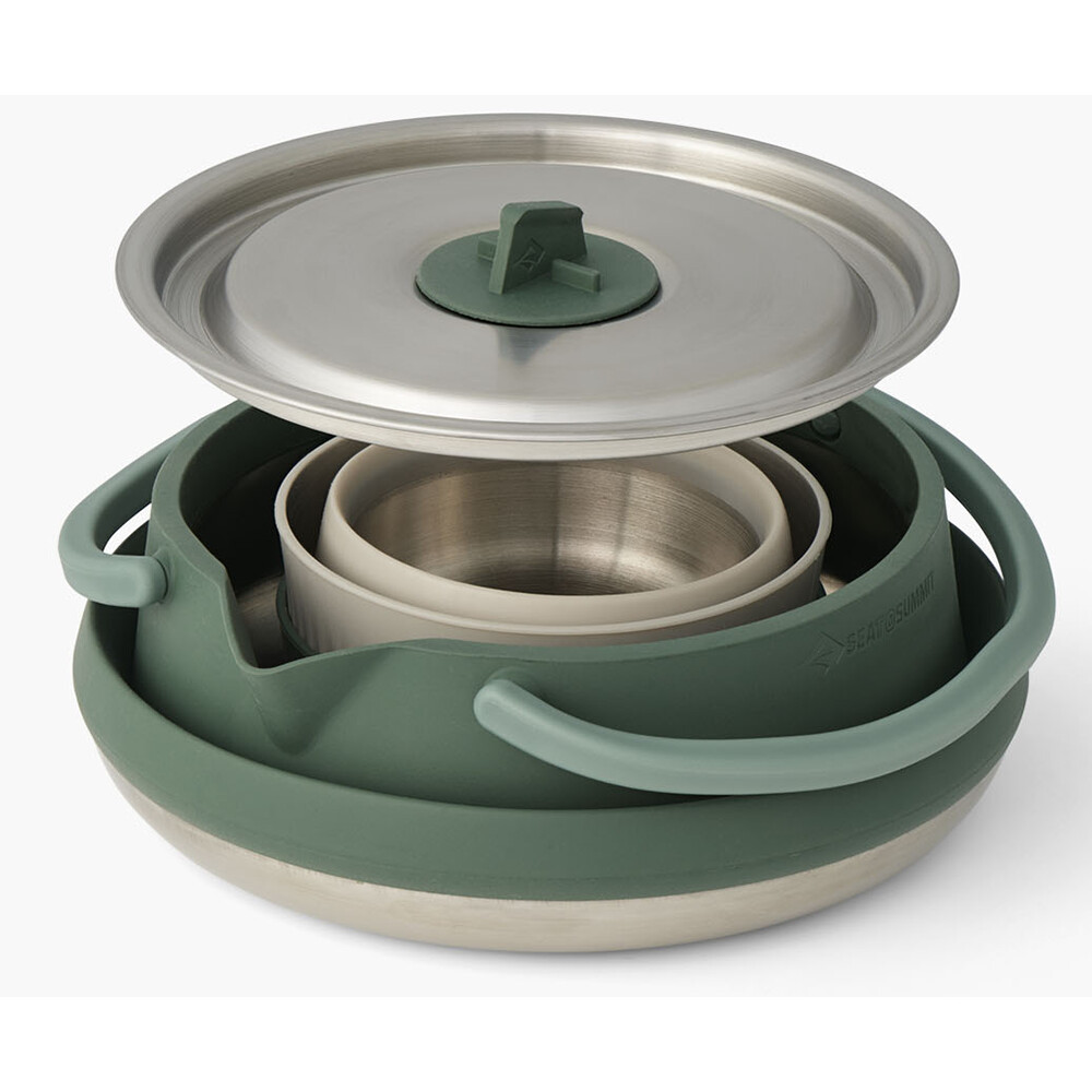 Zestaw do gotowania dla dwojga od Sea to Summit z serii Detour - ultralekkich, składanych naczyń ze stali nierdzewnej, które zachwycą wszystkich fanów lekkich podróży i minimalistycznego wyposażenia. Zestaw zawiera czajnik o pojemności 1,6 litra i dwa kubki. Wszystkie wykonane z połączenia stali nierdzewnej i silikonu spożywczego. Czajnik może być używany na wszystkich rodzajach kuchenek turystycznych, w tym indukcyjnych. Nadaje się do przygotowywania wody na gorące napoje i suszoną żywność, ale sprawdza się również jako garnek na mniejsze porcje gotowanego jedzenia. Po złożeniu cały zestaw zajmuje mniej więcej tyle miejsca w plecaku, co powerbank.