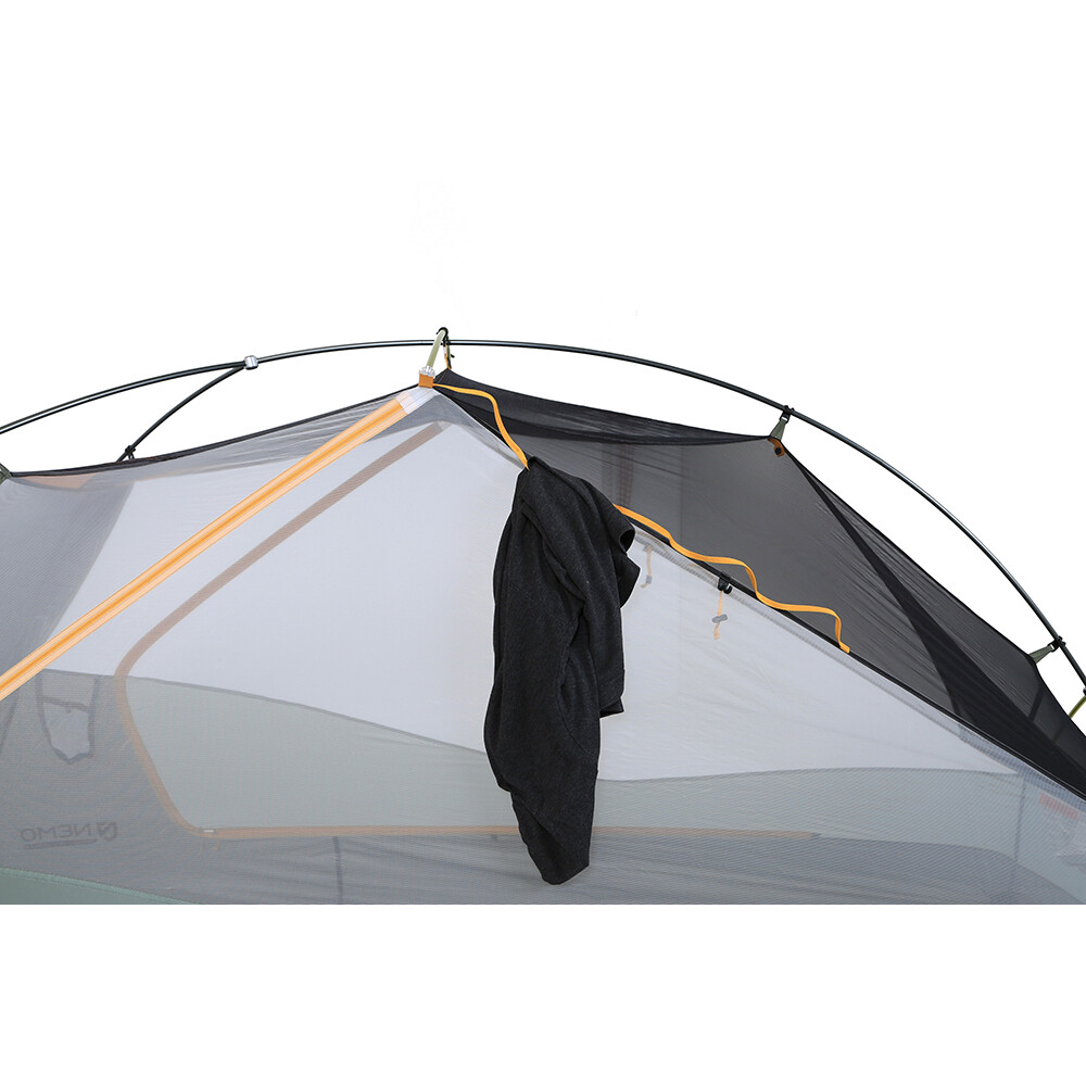 Ultralekki namiot Nemo przeznaczony do jazdy na rowerze lub uprawiania sportów wodnych. Skrócone do 37 cm segmenty kijków umożliwiają przymocowanie go do roweru (pod kierownicą lub na ramie). Powłoka wykonana jest ze wzmocnionego, wodoodpornego materiału, z oczkami ułatwiającymi mocowanie. Wewnątrz namiotu znajdziesz mnóstwo kieszeni do przechowywania rzeczy, w tym specjalną komorę na latarkę czołową. Rozprowadza światło równomiernie po całej przestrzeni, jak podczas świecenia latarnią. W zestawie znajduje się również jeden dodatkowy element podłogi, który tworzy oddzielną suchą i czystą przestrzeń w przedsionku do przechowywania butów i innego sprzętu (strefa lądowania).