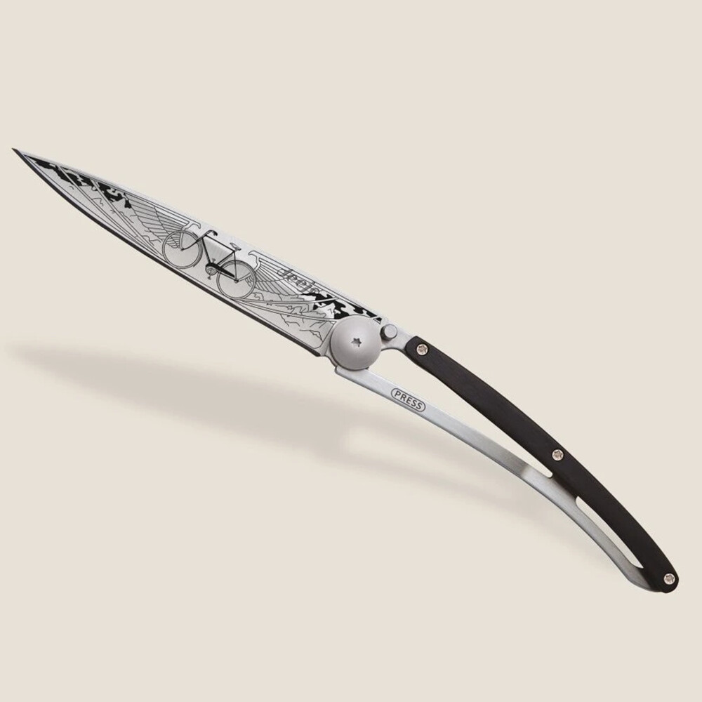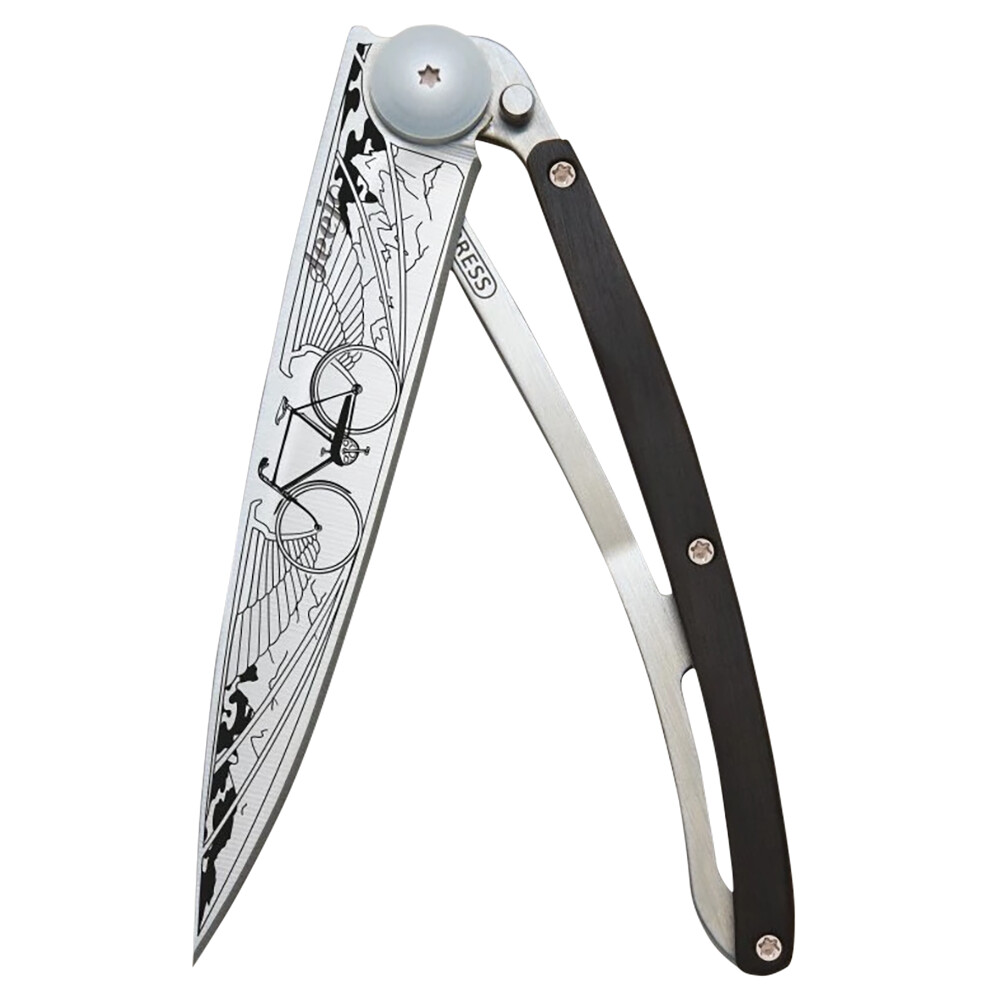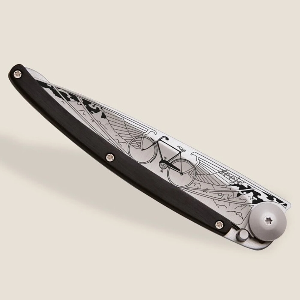 Marka Deejo narodziła się z chęci przywrócenia przyjemności posiadania scyzoryka. Oryginalny, kuty laserowo wzór z motywem kolarskim na ostrzu sprawia, że nóż staje się osobistym akcesorium lub specjalnym prezentem. Ponadto zawsze wykonany ze szlachetnych materiałów, z blokadą bezpieczeństwa i klipsem do paska. Pochwa wykonana jest z egzotycznego drewna granadilla, które pochodzi z drzew rosnących w Afryce. Wyróżnia się twardością, oleistością i ciemnym, niebiesko-czarnym kolorem.