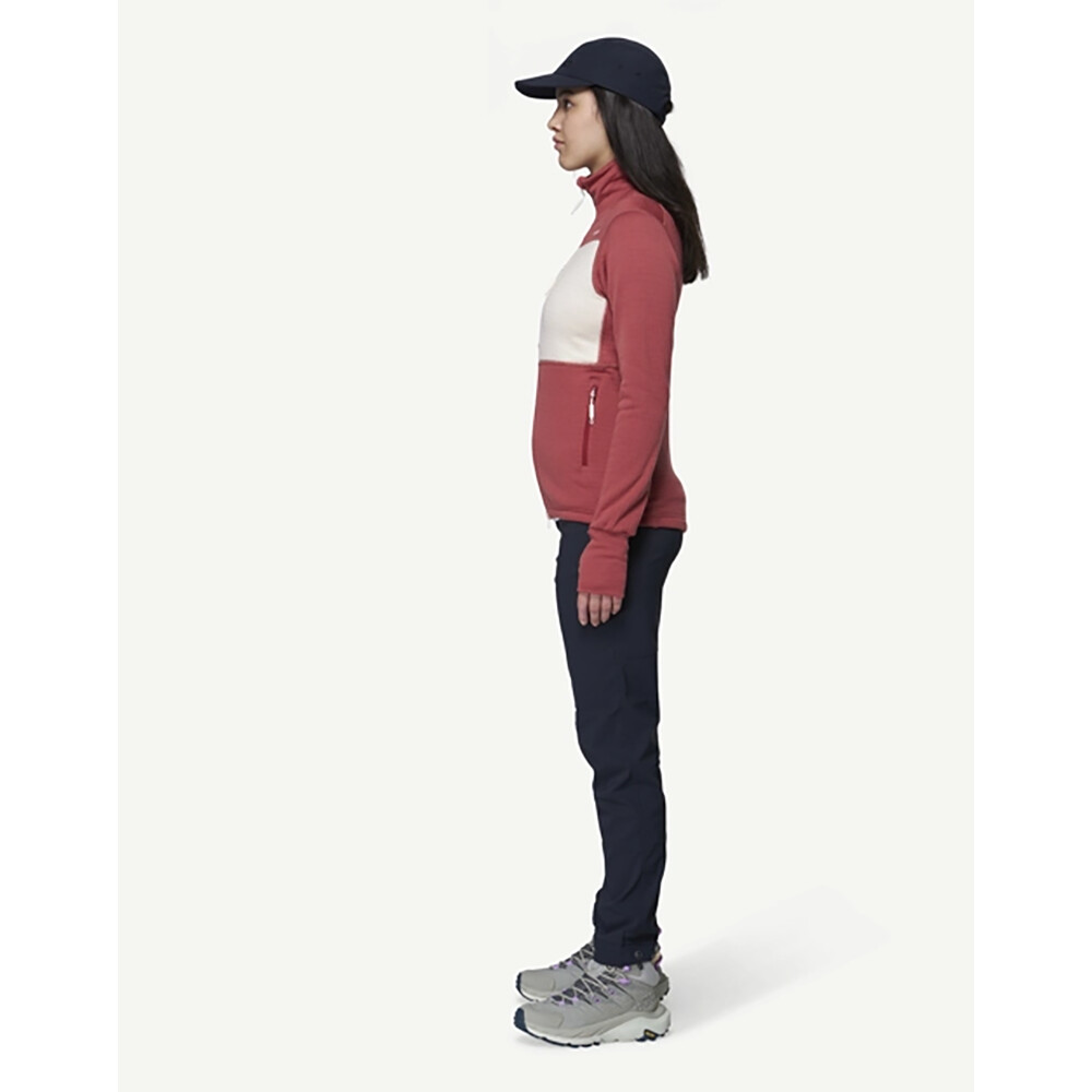Damska rozpinana bluza z kapturem i stójką. Nadaje się do aktywności na świeżym powietrzu i noszenia na co dzień. Dwuwarstwowa konstrukcja z merynosów poprawia odprowadzanie wilgoci. Zewnętrzna warstwa wykonana jest z mieszanki wełny i syntetyku.