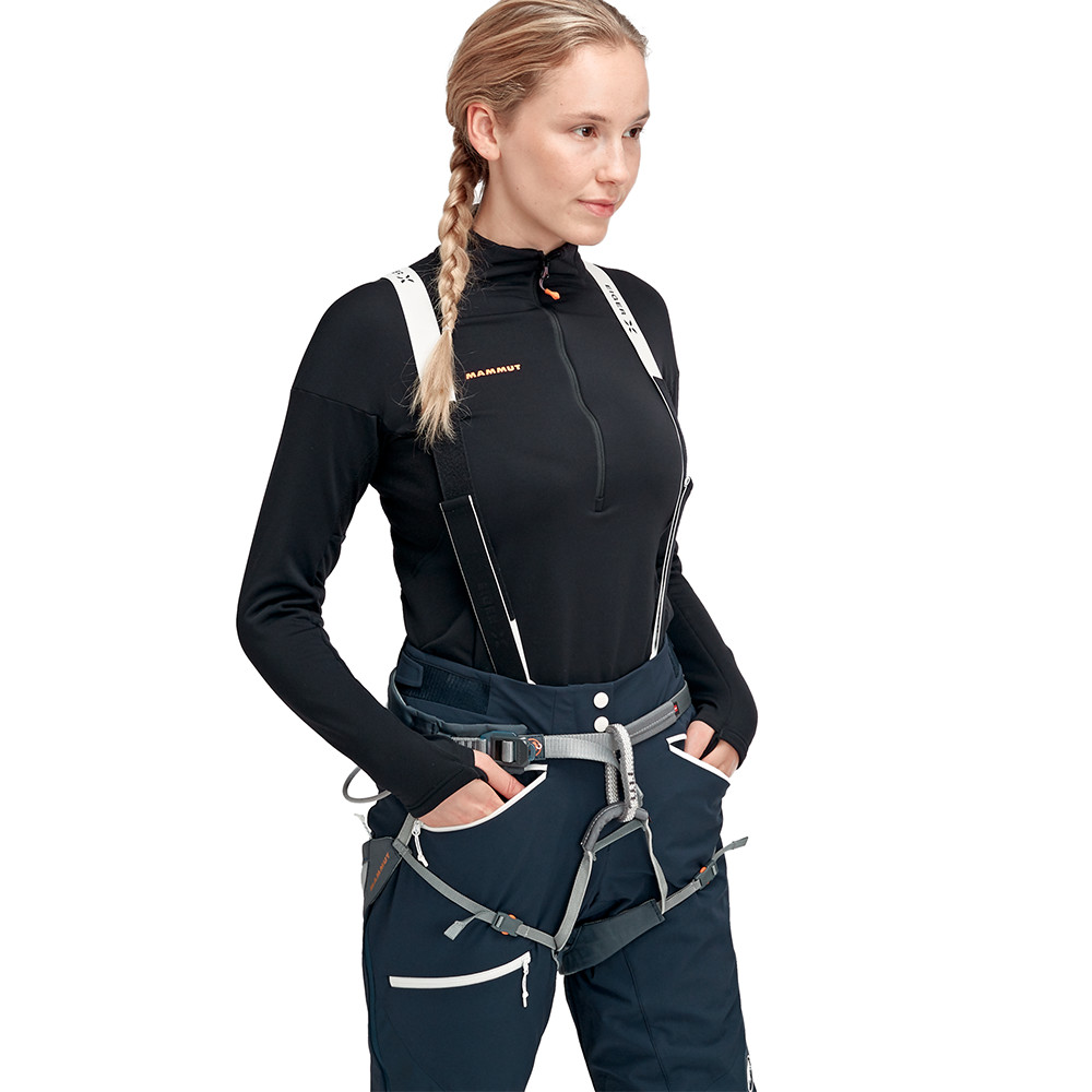 Spodnie mają wewnętrzną ochronę przeciwśnieżną, którą można zdejmować i regulować za pomocą zamka błyskawicznego z zapięciami na rzepy do butów. Wzmocnienia z materiału Dyneema® chronią nogawki przed przecięciem przez raki. Szerokość spodni można regulować za pomocą rzepów.