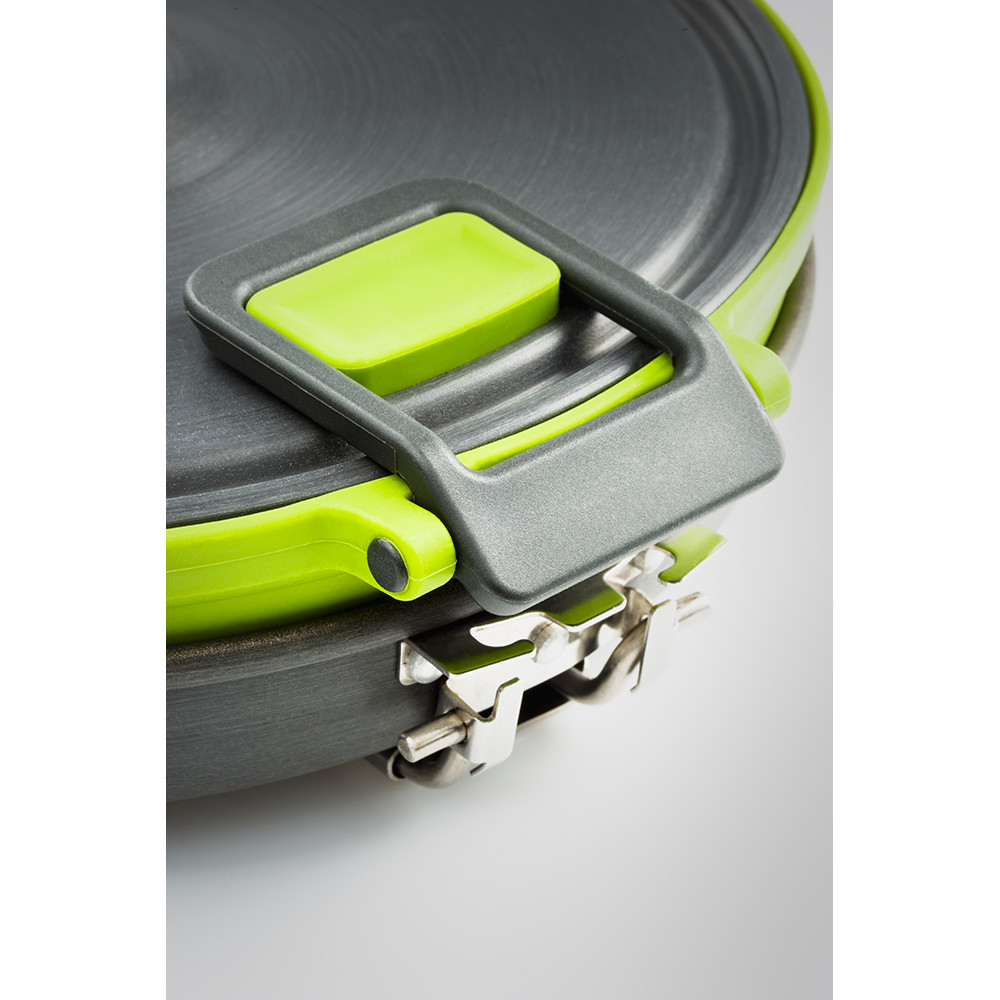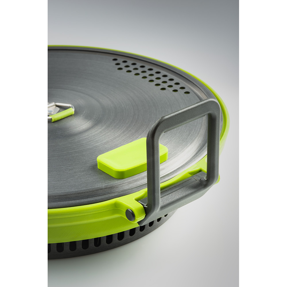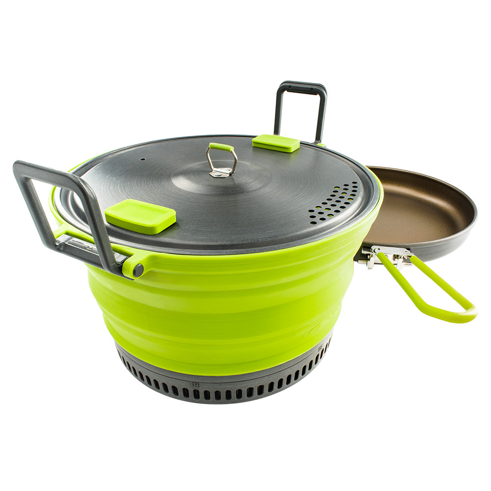 Składany garnek z wymiennikiem ciepła, pokrywką i patelnią. Garnek i patelnia mają teflonowe dno, dzięki czemu potrawy nie przypalają się. Patelnia ma zintegrowany uchwyt, a garnek posiada uchwyty ułatwiające przenoszenie. Jednocześnie pętle na garnku służą do stabilnego zamocowania pokrywki. Pokrywka ma specjalną kratkę, przez którą para może się dobrze wydostawać, a także może być używana do łatwego nalewania. Garnek GSI z przyjemnością spędzi z Tobą tydzień w górach lub na kempingu.