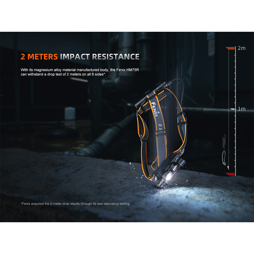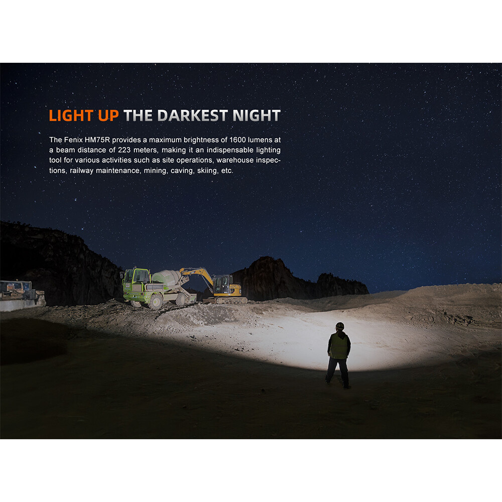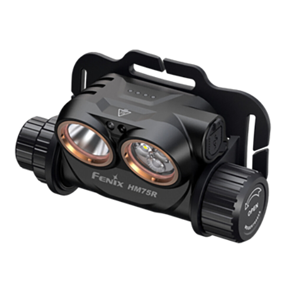 Wysokowydajna latarka czołowa HM75R marki Fenix została wyposażona w dwa reflektory, mocne czerwone światło oraz dwa źródła zasilania. Główny reflektor wytwarza skupioną wiązkę światła o zasięgu do 223 m, natomiast drugi reflektor świeci bardzo szerokim stożkiem ciągłego światła o zasięgu do 60 m. Reflektor posiada pojedynczy zasilacz umieszczony bezpośrednio w jego obudowie. Drugie źródło zasilania składa się z oddzielnego pojemnika na baterie, który jest mocowany za pomocą metalowej klamry z tyłu na pasku. Dzięki temu można go łatwo zdemontować i może służyć jako power bank dla innych urządzeń elektronicznych, takich jak zegarki sportowe lub słuchawki. Można również użyć klipsa, aby umieścić ten zasilacz na pasku, pasku plecaka lub za kieszenią spodni.