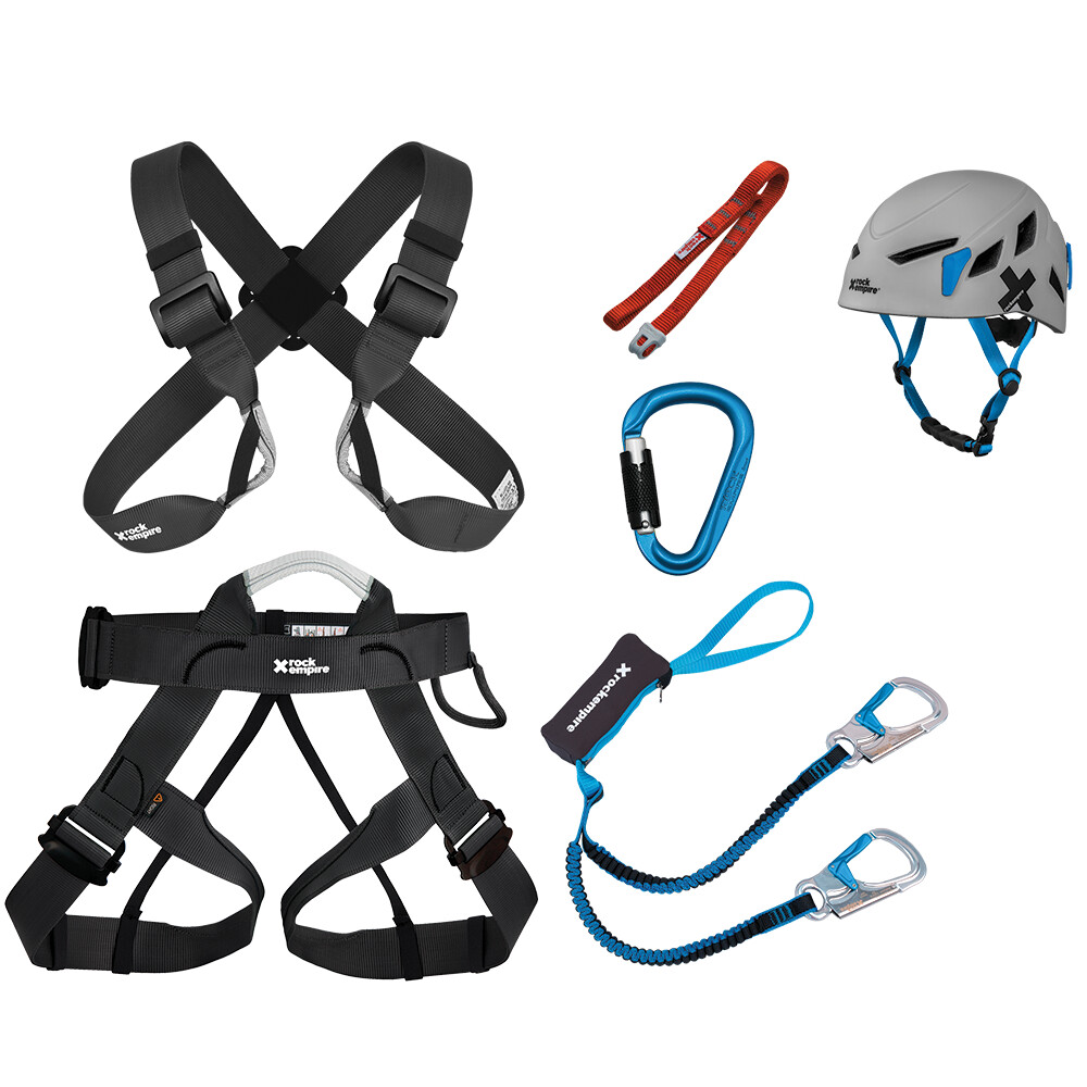 Do połączenia obu uprzęży służy praktyczna pętla Ferrata Connect z karabinkiem. W komplecie znajduje się hamulec do ferraty DynaGo oraz lekki kask Galeos Evo.