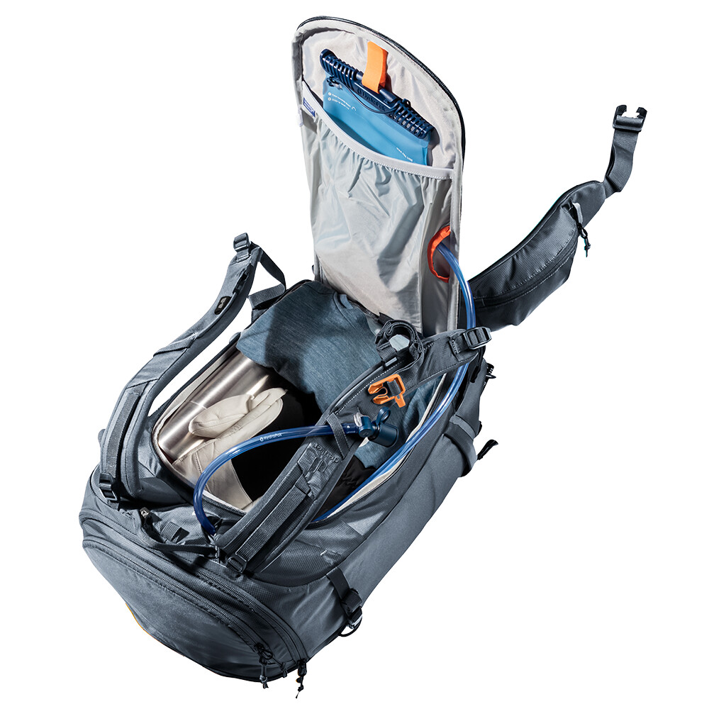 Damski plecak skialpowy Freerider Pro marki deuter to wszechstronne rozwiązanie na jedno- i wielodniowe zimowe wycieczki. Posiada klasyczne zapięcie na suwak oraz zwijane przedłużenie z paskami ściągającymi, które pozwala zwiększyć objętość plecaka nawet o 10 L. Możesz spakować do niego więcej rzeczy, w tym śpiwór w przypadku dłuższej wędrówki. Nawet przy zwiększonej objętości plecak nie krępuje ruchów głowy, co docenisz zwłaszcza na stromych podejściach lub przejściach wspinaczkowych. Kolejną ciekawą funkcją jest zamek błyskawiczny z tyłu, dzięki któremu można wyjąć sprzęt z głównej kieszeni bez konieczności zdejmowania nart przymocowanych do plecaka.