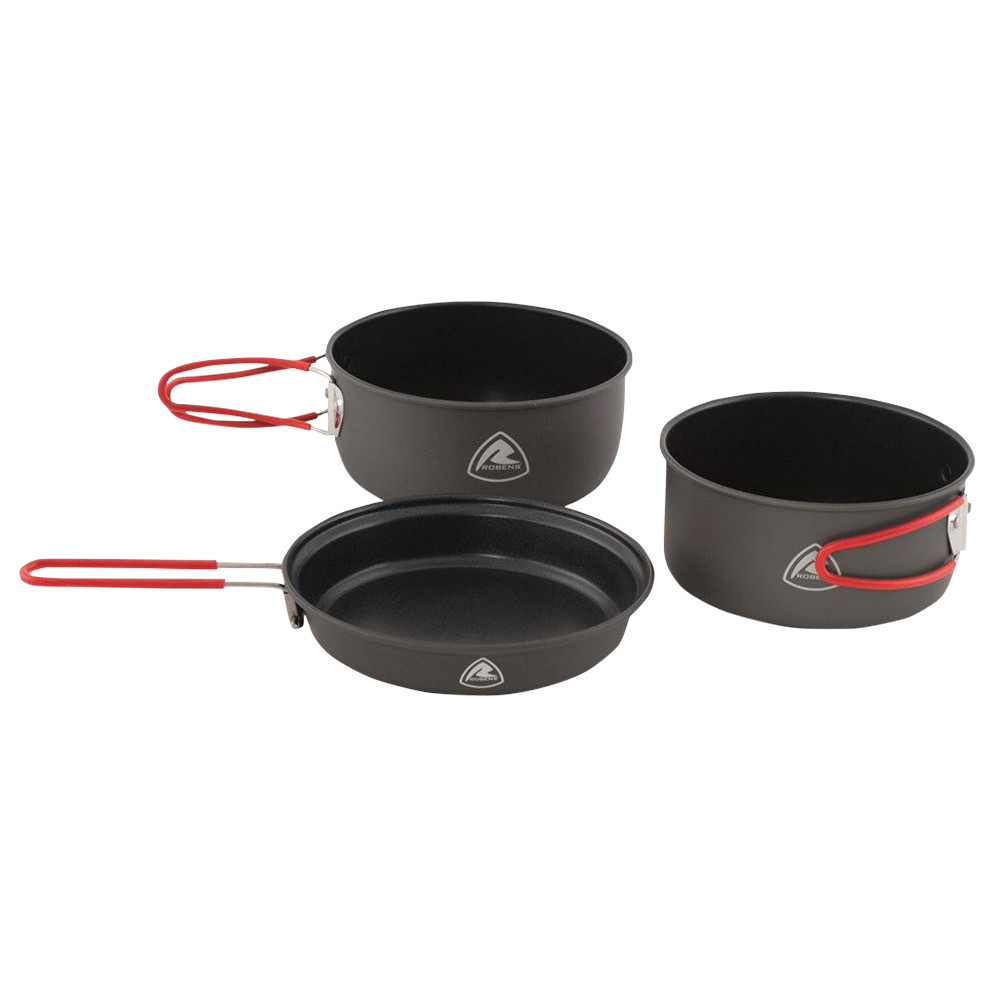 Zestaw garnków Robens składa się z większego garnka o pojemności 1,6 litra, mniejszego garnka o pojemności 1,4 litra oraz patelni, która służy również jako pokrywka. Całość wykonana jest z lekkiego anodyzowanego aluminium, które jest bezpieczne dla zdrowia i nieprzywierające. Dzięki temu naczynia są łatwe do utrzymania w czystości nawet podczas gotowania na zewnątrz. Wszystkie trzy naczynia są wyposażone w składany uchwyt ze stali nierdzewnej z silikonową ochroną przed poparzeniem dłoni. Zaleca się używanie plastikowych sztućców z zestawem, aby uniknąć zarysowania wewnętrznej powierzchni.