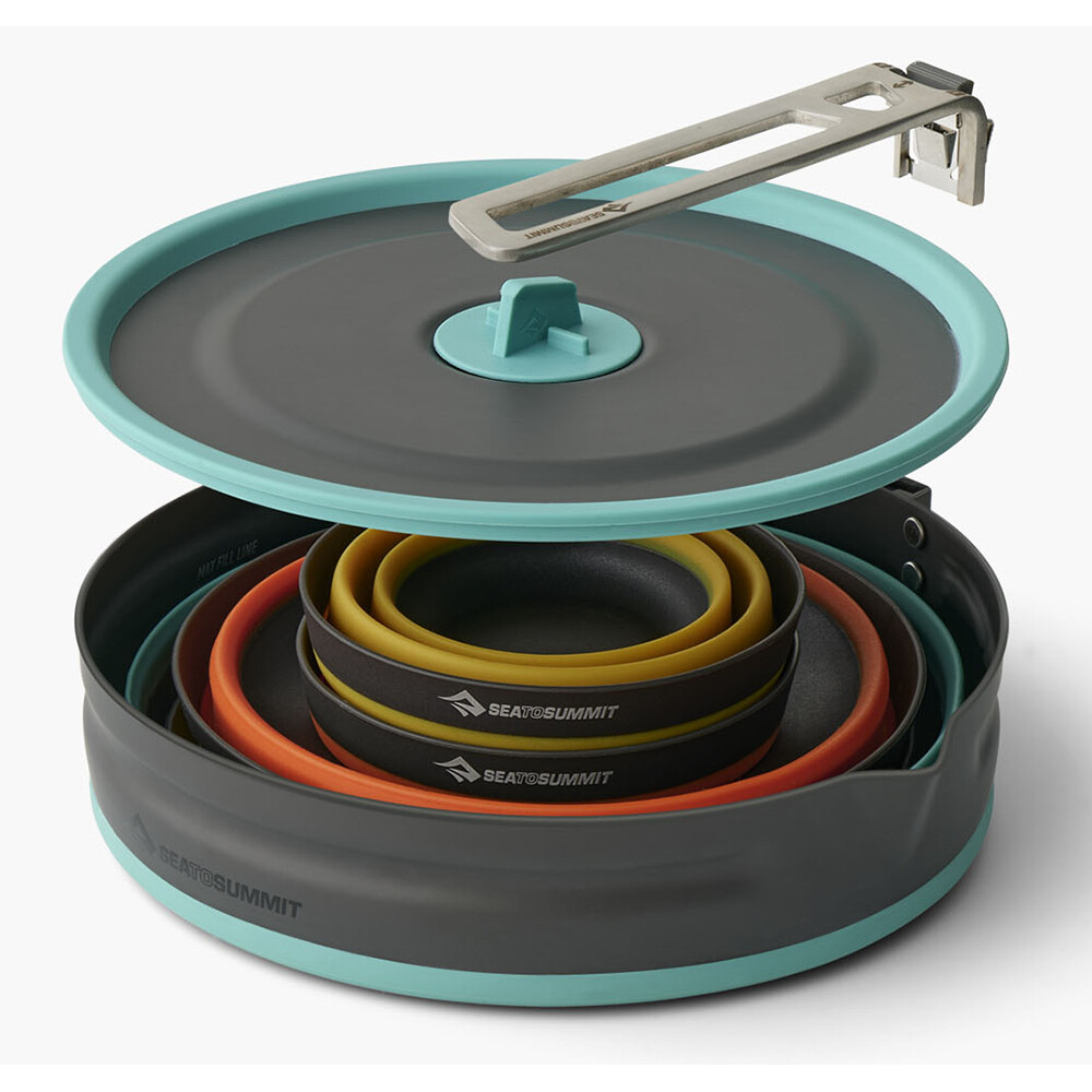 Kompletny zestaw do gotowania i serwowania posiłków od Sea To Summit. Zawiera składany garnek, dwie składane miski i dwa składane kubki. Garnek wykonany jest z połączenia silikonu spożywczego i anodyzowanego aluminium. Dzięki temu jest lekki, a ponadto można go idealnie układać w stosy, więc nawet nie będziesz wiedział, że jest w plecaku. Miski i kubki nadają się do gorących i zimnych napojów/jedzenia i doskonale zachowują swój kształt nawet po całkowitym napełnieniu. Naczynia nadają się do długodystansowych wędrówek i wszędzie tam, gdzie chcesz zaoszczędzić wagę i miejsce w bagażu.