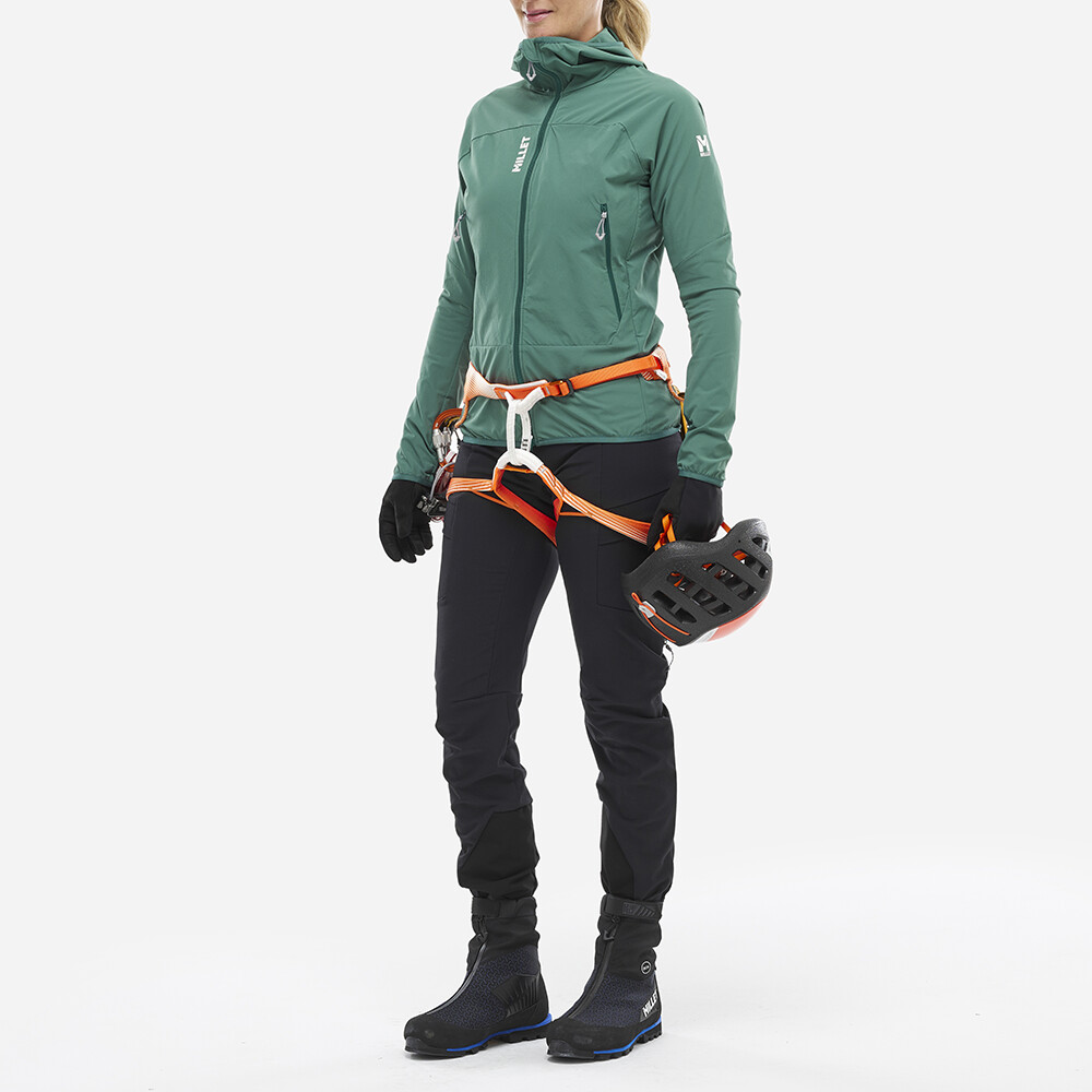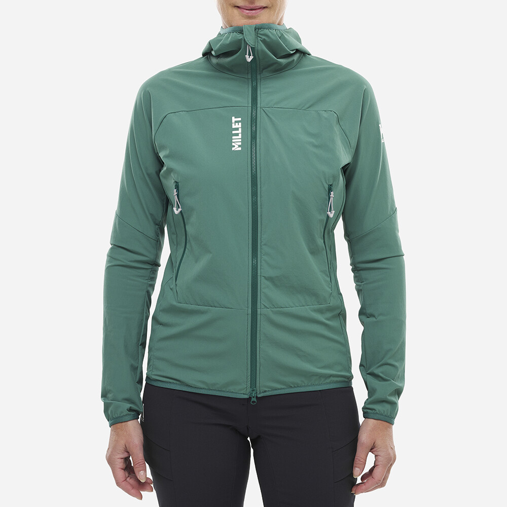 Kurtka jest wykonana z wiatroszczelnego i oddychającego materiału. Elastyczny materiał nie ogranicza ruchów. Ergonomicznie ukształtowany kaptur wygodnie przylega i chroni podczas wietrznej pogody. Kieszenie zapinane na zamek są doskonale dostępne, nawet gdy masz na sobie siodełko wspinaczkowe. Kobiecy krój podkreśla kobiece kształty. Dwukierunkowy zamek błyskawiczny umożliwia łatwe ubieranie i regulację temperatury. Elastyczne mankiety przy kapturze, rękawach i u dołu zabezpieczają kurtkę na miejscu.