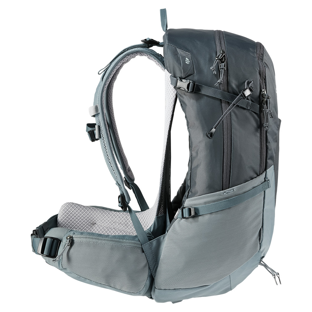 Damski plecak turystyczny deuter Futura 25 SL będzie świetnym towarzyszem podczas wypraw eksploracyjnych, niezależnie od tego, czy są to ferraty, górskie wędrówki, czy po prostu wędrówki po lesie. Futura ma siateczkowe plecy z podkładkami wokół kręgosłupa i perforacjami na paskach naramiennych. Metalowe wzmocnienie dba o rozłożenie ciężaru, który kładziesz na ramionach. Docenisz przednią elastyczną kieszeń kurtki na kaprysy pogody.
