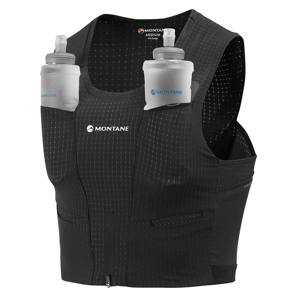Ultralekka kamizelka do biegania Montane Gecko Ultra V jest odpowiednia do treningów i wyścigów. Wystarczy naciągnąć ją na głowę, zapiąć, napełnić butelki z wodą, włożyć odżywki do kieszeni i już można biec.