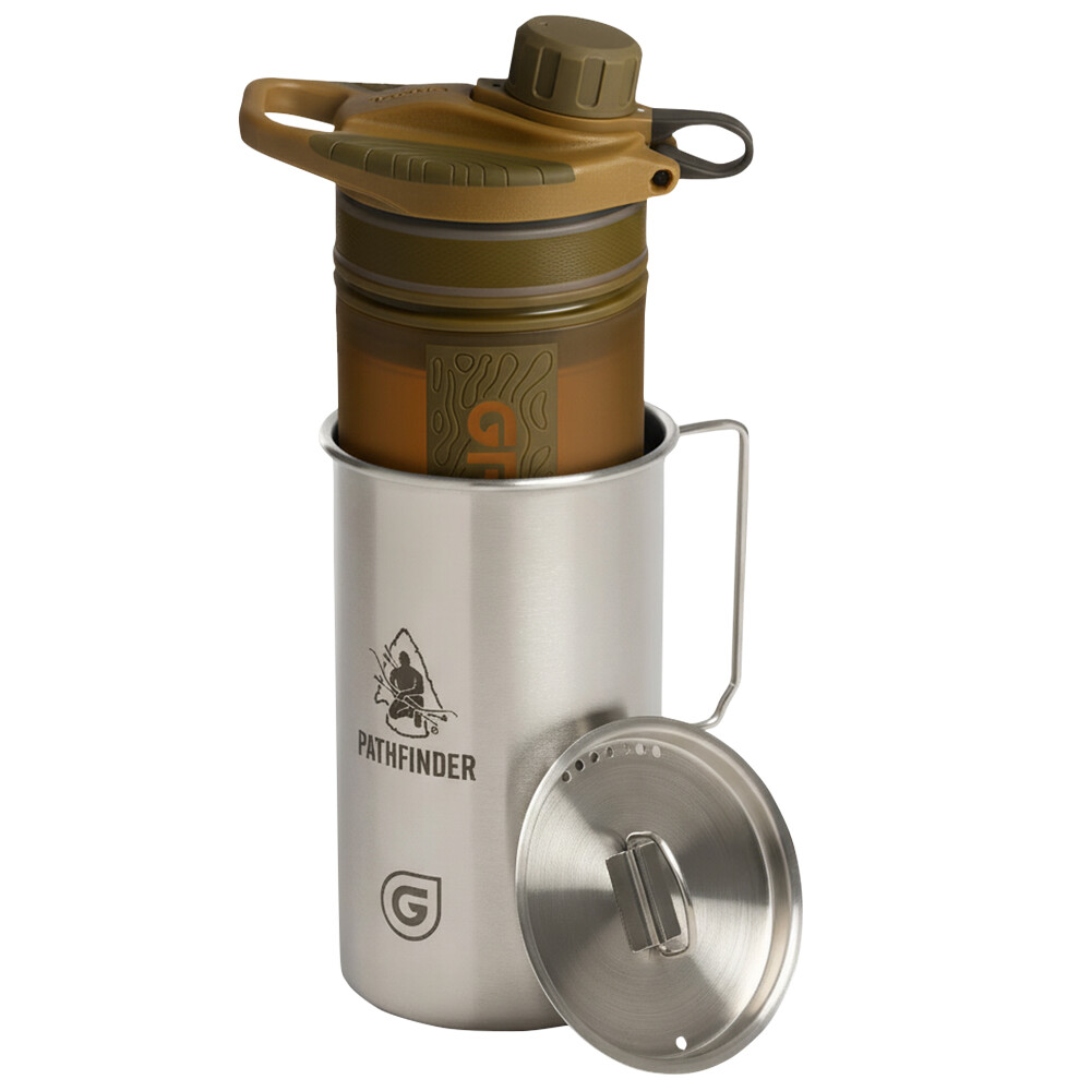 Butelka filtrująca Geopress oraz naczynie do gotowania ze stali nierdzewnej Geopress Nesting Cup w prezencie. Kompletny zestaw do uzdatniania wody i gotowania na świeżym powietrzu od Grayl.