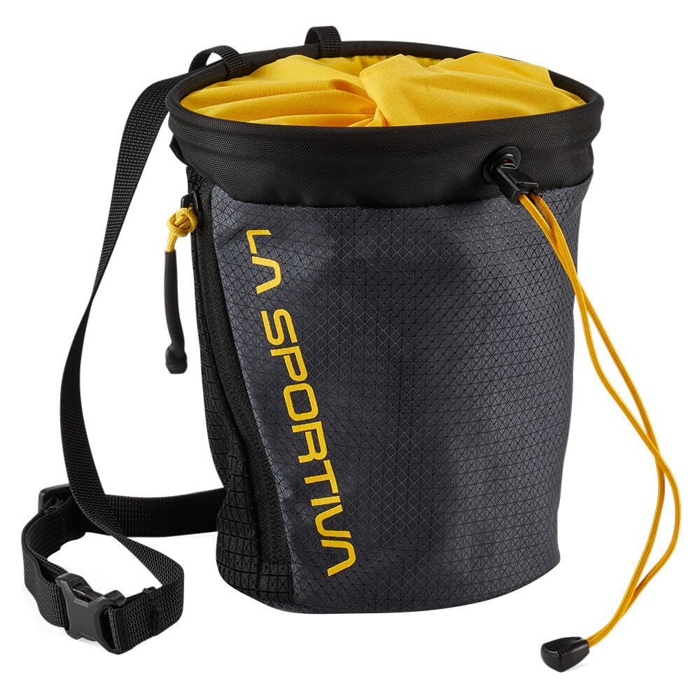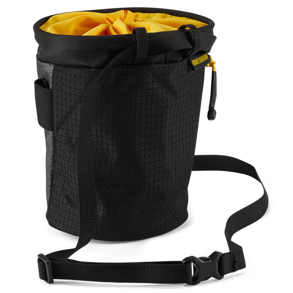 Granite Pro Chalk Bag włoskiej marki La Sportiva to worek na magnezję wykonany z trwałego i mocnego nylonu HT Robic X Grid. Ta tkanina UHMWPE 210 jest używana przez markę La Sportiva do produkcji plecaków wspinaczkowych. Materiał pochodzi z przetworzonych resztek. Sztywna rama w dolnej części torby pozwala na jej stabilne ustawienie na podłodze podczas boulderingu. Pasek wokół talii służy do zawieszenia go podczas wspinaczki linowej.