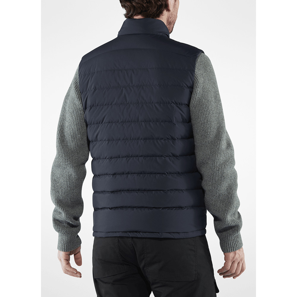 Kamizelka Fjällräven zapewniająca dodatkowe ciepło zawsze, gdy tego potrzebujesz. Dwie boczne kieszenie na suwak, elastyczne zakończenia i skórzane logo po lewej stronie kamizelki.