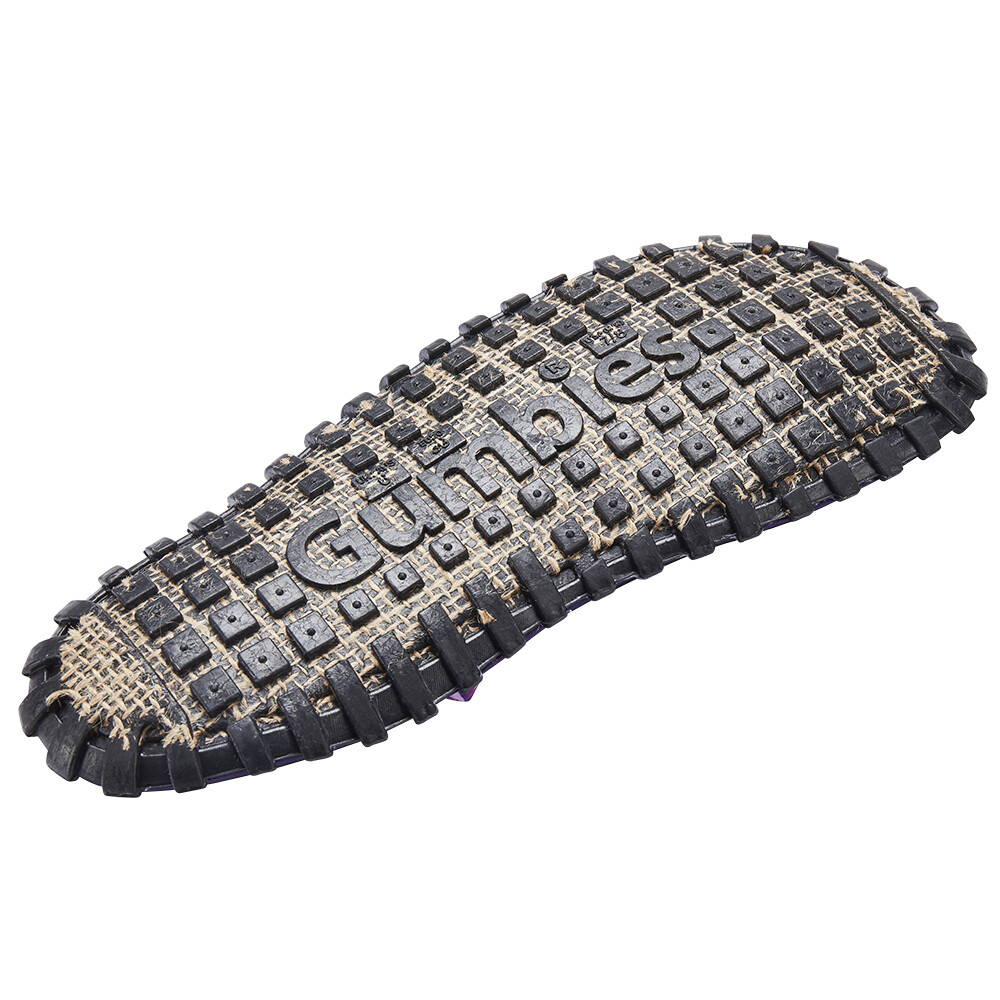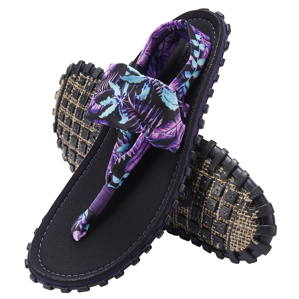 Naturalne i pochodzące z recyklingu materiały są podstawą klapek Gumbies Slingback Purple Haze. Na szczególną uwagę zasługuje anatomicznie ukształtowana podeszwa wykonana z gumy pochodzącej z recyklingu i siatki jutowej. Idealnie dopasowuje się do stopy i wspiera jej łuk. Amortyzująca pianka EVA w podeszwie środkowej i wygodna wkładka z płótna bawełnianego również przyczyniają się do wysokiego komfortu podczas noszenia. Wszystko to uzupełnia szeroki pasek wykonany z niezwykle miękkiej tkaniny, która nie ociera się między palcami.