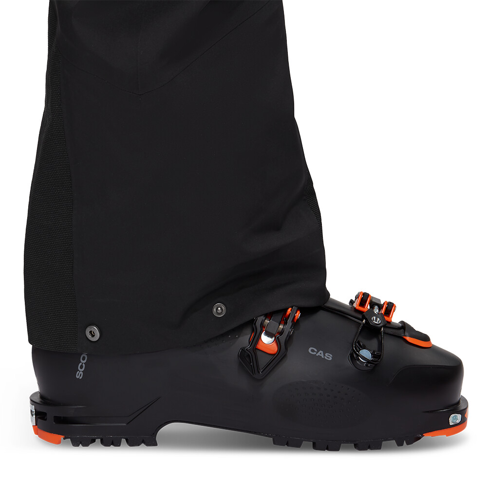 Spodnie są wykonane z trójwarstwowego materiału Mammut DRY Expedition, który jest wodoodporny, wiatroszczelny i oddychający. Krój z wyższą talią i szelkami zapobiega przedostawaniu się śniegu. Dwa zapinane na zamek otwory wentylacyjne na nogawkach umożliwiają regulację temperatury. Kieszenie są wyposażone w wodoodporne zamki błyskawiczne. Miłym detalem jest zintegrowana kieszeń na telefon wykonana z ciepłego neoprenu. Spodnie są wzmocnione materiałem Dyneema® i wyposażone w mankiety przeciwśnieżne. Szerokość nogawek można łatwo regulować za pomocą przycisków.