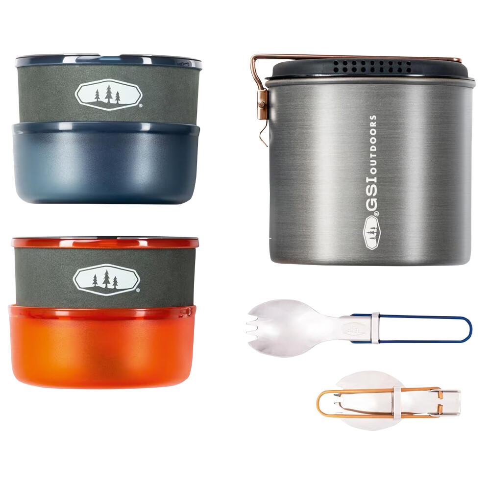 Zestaw naczyń kuchennych GSI zawiera wszystko, czego potrzebujesz do gotowania na świeżym powietrzu lub na kempingu. W zestawie znajduje się garnek o pojemności 1,8 litra z pokrywką, dwie miski, dwa kubki z neoprenowymi rękawami, dwie składane łyżki (spork) i pojemnik wykonany z mocnego klejonego materiału, którego można używać jako miski. Garnek posiada praktyczny lejek, pokrywkę z durszlakiem i składany uchwyt. Cały zestaw można idealnie spakować razem, łącznie z małym nabojem gazowym (220 g) i kuchenką. Pozwoli to zaoszczędzić miejsce w plecaku podczas wielodniowej wędrówki, jazdy na rowerze czy podróży samochodem lub motocyklem.
