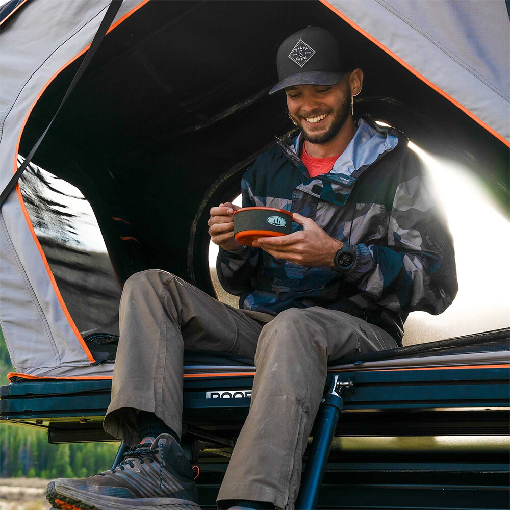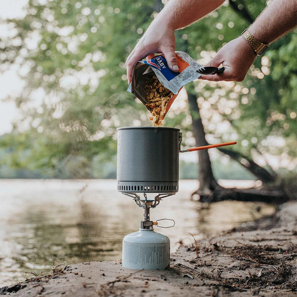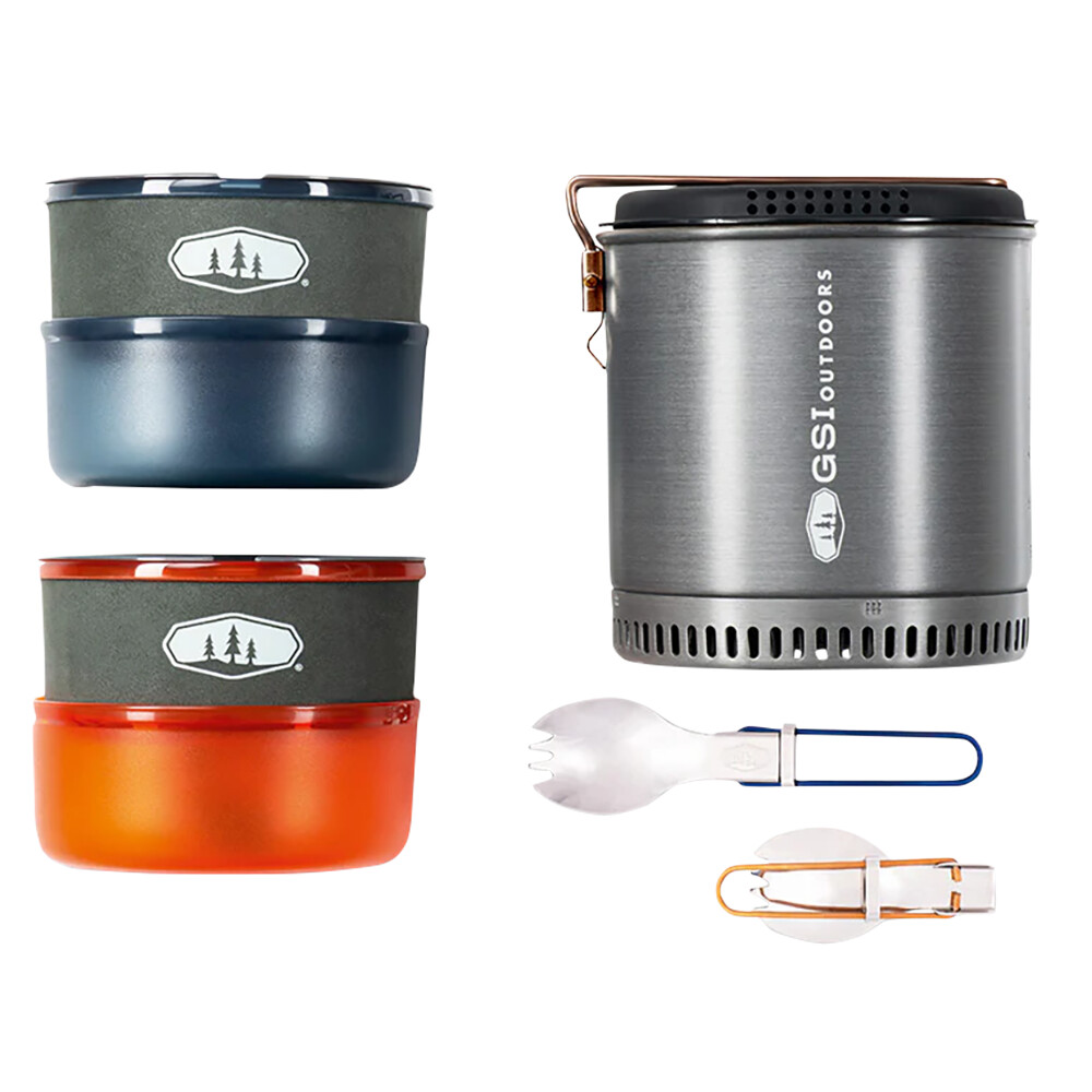 Kompletny zestaw do gotowania i serwowania od GSI, odpowiedni dla dwóch osób. Zawiera garnek wykonany z wytrzymałego anodyzowanego aluminium, wyposażony w wymiennik ciepła. Dzięki temu można zagotować wodę do 30% szybciej i znacznie zaoszczędzić na paliwie do kuchenki. Garnek wyposażony jest w pokrywkę z otworami do nalewania wody oraz składany uchwyt. W zestawie znajdują się również dwie miski i dwa kubki. Ich szeroki kształt z nisko położonym środkiem ciężkości zapobiega przypadkowemu przewróceniu, a rękaw izolacyjny dłużej utrzymuje temperaturę napojów i żywności. Spakuj cały zestaw, w tym dwie składane łyżki, do garnka, aby zaoszczędzić miejsce w plecaku.