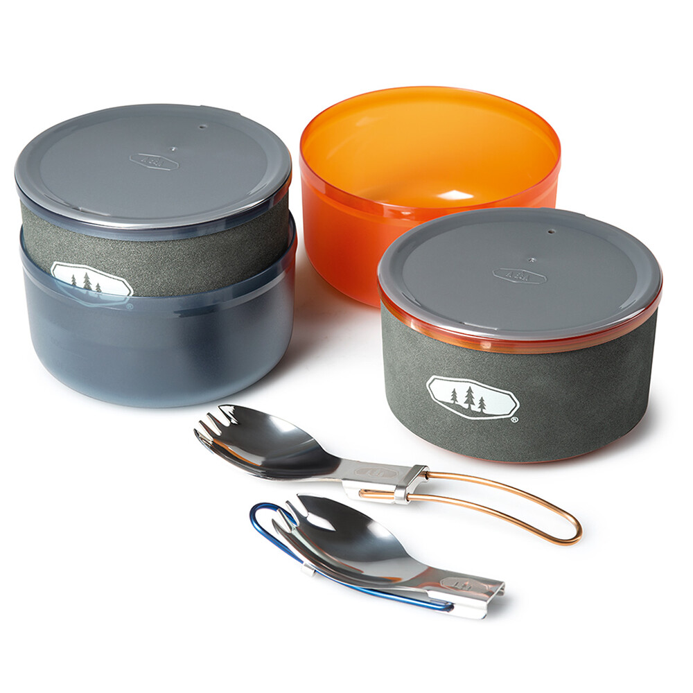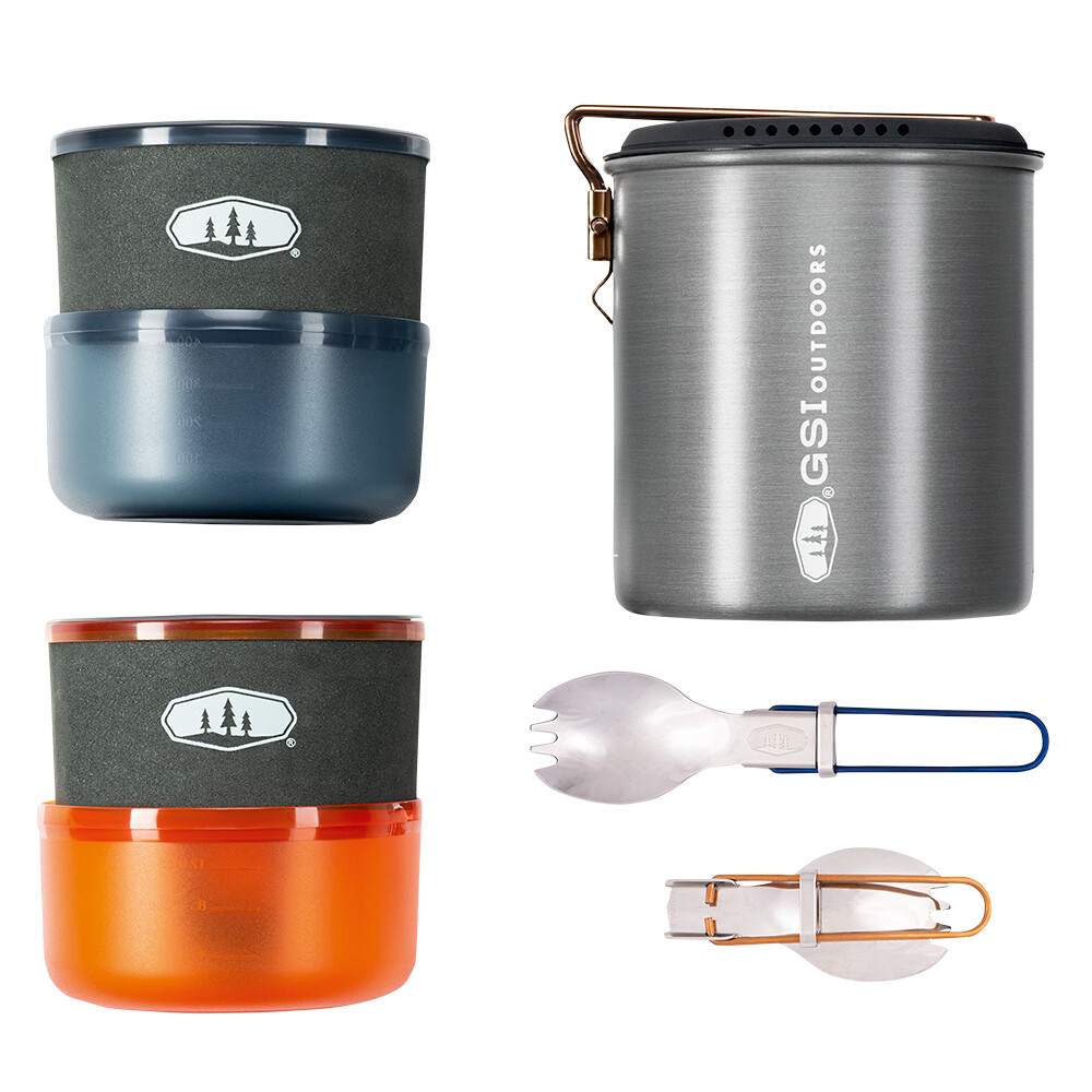 Zestaw naczyń kuchennych GSI zawiera wszystko, czego potrzebujesz do gotowania na świeżym powietrzu lub na kempingu. Obejmuje garnek z pokrywką o pojemności 1,4 litra, dwie miski, dwa kubki z neoprenowymi rękawami, dwie składane łyżki (spork) i pojemnik wykonany z mocnego klejonego materiału, którego można używać jako miski. Garnek posiada praktyczny lejek, pokrywkę z durszlakiem i składany uchwyt. Cały zestaw można idealnie spakować razem, łącznie z małym nabojem gazowym (110 g) i kuchenką. Pozwoli to zaoszczędzić miejsce w plecaku podczas wielodniowej wędrówki, jazdy na rowerze czy podróży samochodem lub motocyklem.