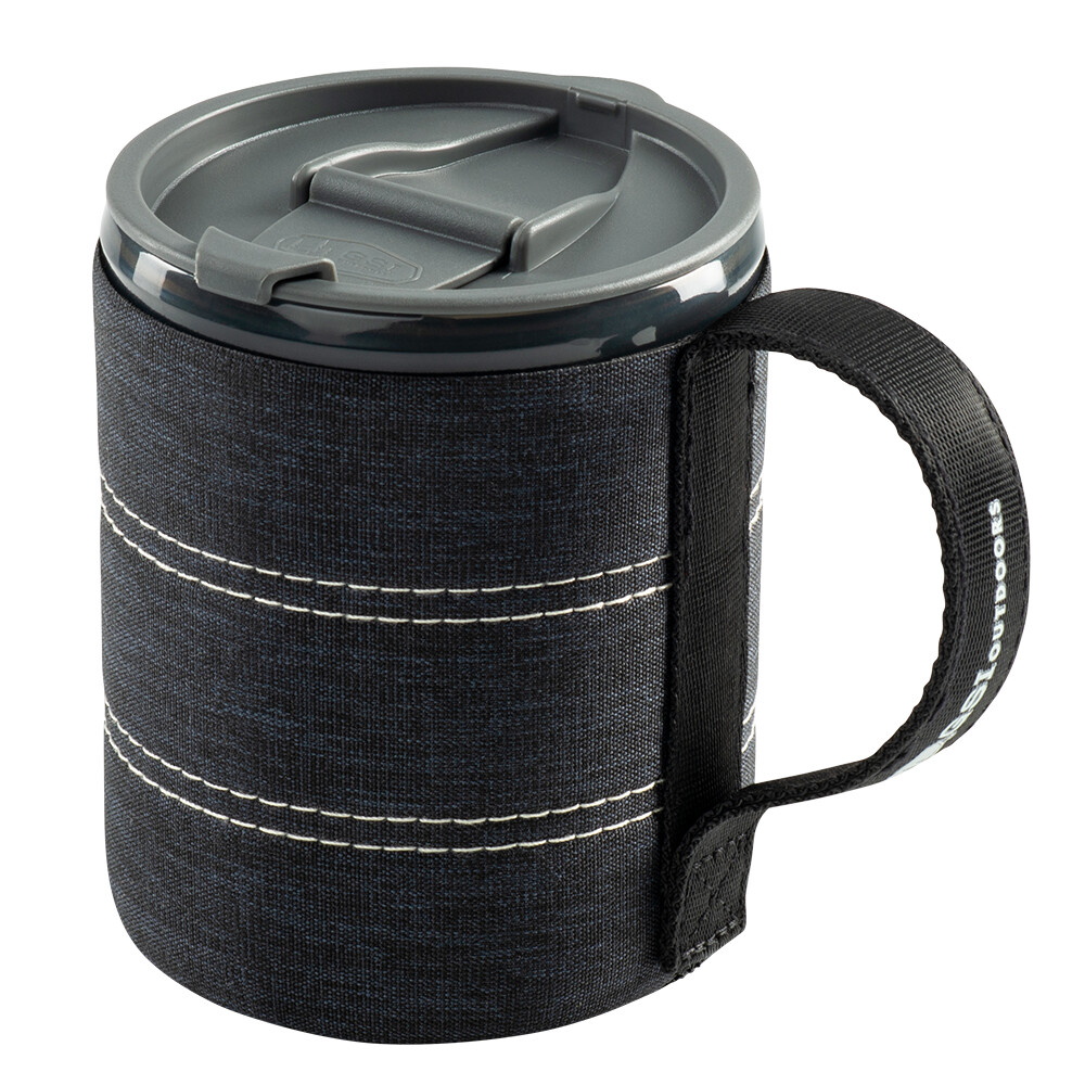 Lekki kubek od GSI Outdoors wykonany w 100% z nadającego się do recyklingu polipropylenu. Ten zamykany kubek jest chroniony przez materiałowy rękaw.