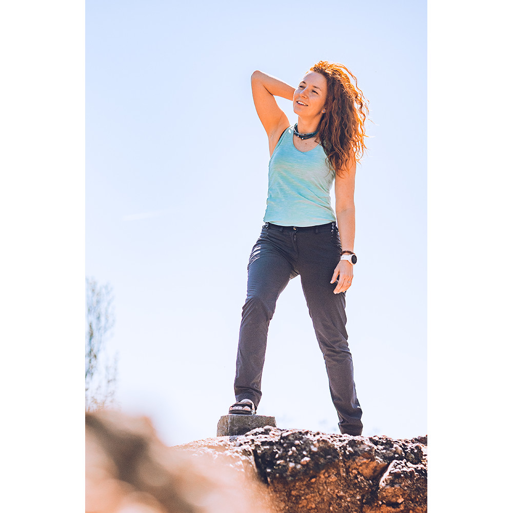 Damskie wygodne spodnie z serii Climbing. Idealnie dopasowany krój nie ogranicza ruchów podczas wspinaczki. Posiadają elastyczny pas ze sznurkiem ściągającym. Wykonane są z oddychającego i elastycznego materiału.