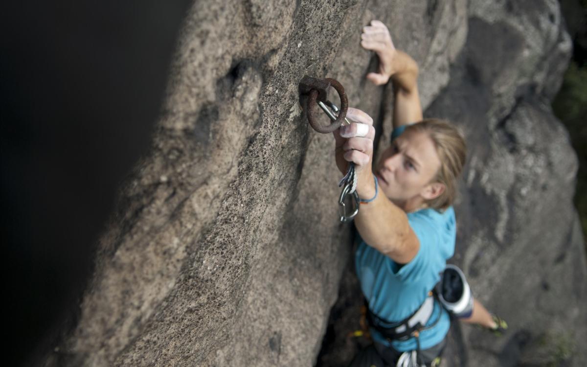 - Jeśli to możliwe, zaczep linę w ekspresie na poziomie uprzęży. Zaciskanie liny wyciągniętym ramieniem jest mocniejsze, a w razie niepowodzenia upadek jest znacznie dłuższy.
