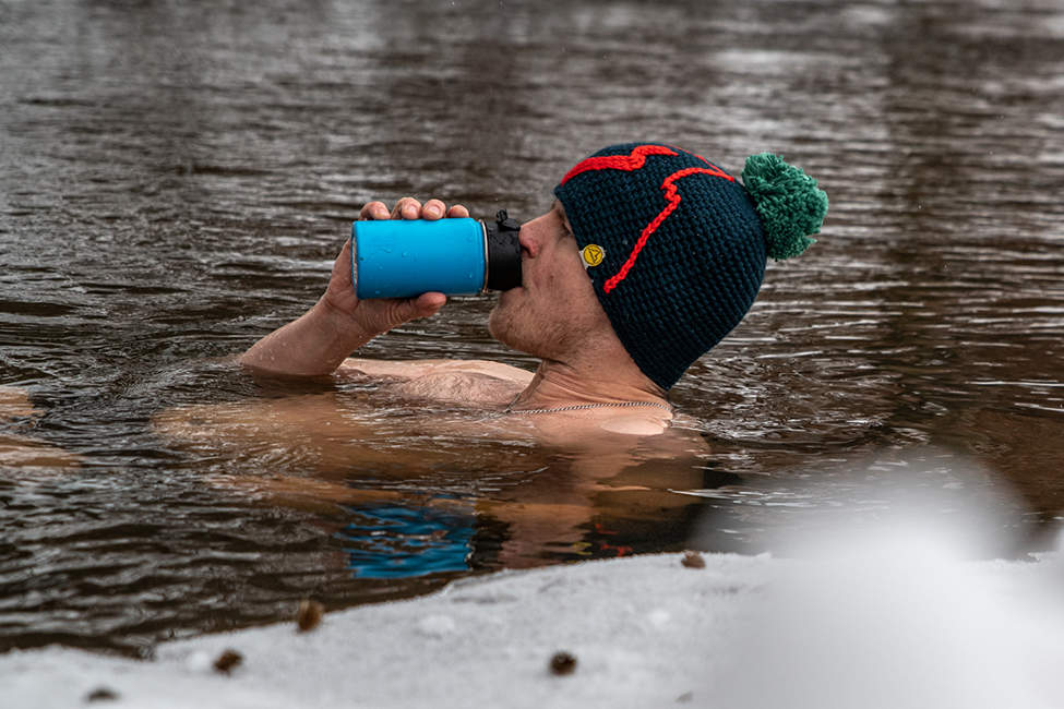 Prawie nic, co jest świetne. Możesz pływać nago, ale licz się z tym, żepo wyjściu z wody przydałoby się osuszyć ciało . Ręcznik w kieszeni to idealne rozwiązanie. Chociaż można też wytrzeć się śniegiem. Cóż, można wypróbować jeden dzień. Nie zapomnij dodać do swojego ekwipunku kapci lub butów neoprenowych, a nawet rękawiczek, szlafroka, kawałka maty do spania pod stopami, a nawet rozpalić ognisko na brzegu. Sandały lub buty neoprenowe są świetne. Po pierwsze chronią przed urazami i oczywiście trochę izolują, bo stopy często bolą po wyjściu z wody. Niektórzy cierpią bardziej, inni mniej. Dobrym pomysłem jest też termos z gorącą herbatą lub zupą. Alkoholu należy unikać zarówno przed, jak i po.