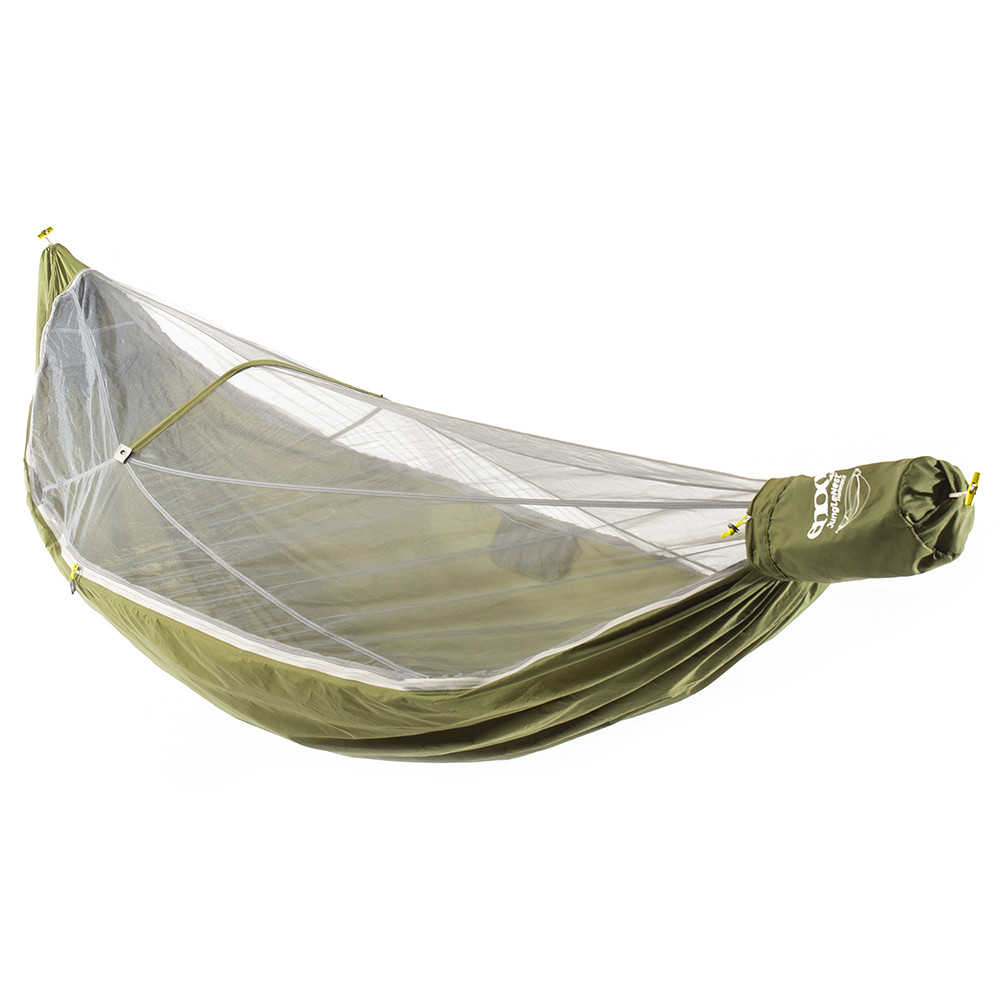 Wydłużona długość pozwala na znalezienie wygodnej, prostej pozycji podczas leżenia po przekątnej. Zintegrowaną moskitierę zapewniającą niezakłócony sen można całkowicie rozpiąć i schować w pokrowcu transportowym. Wbudowane wzmocnienia w moskitierze zwiększają przestrzeń wewnętrzną, podobnie jak w namiocie. Wszystko to w kompaktowej obudowie ważącej pół litra.