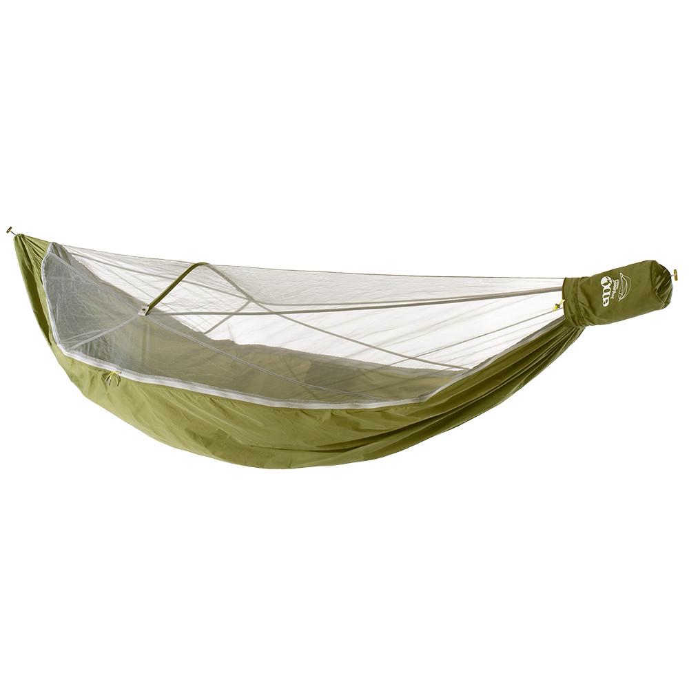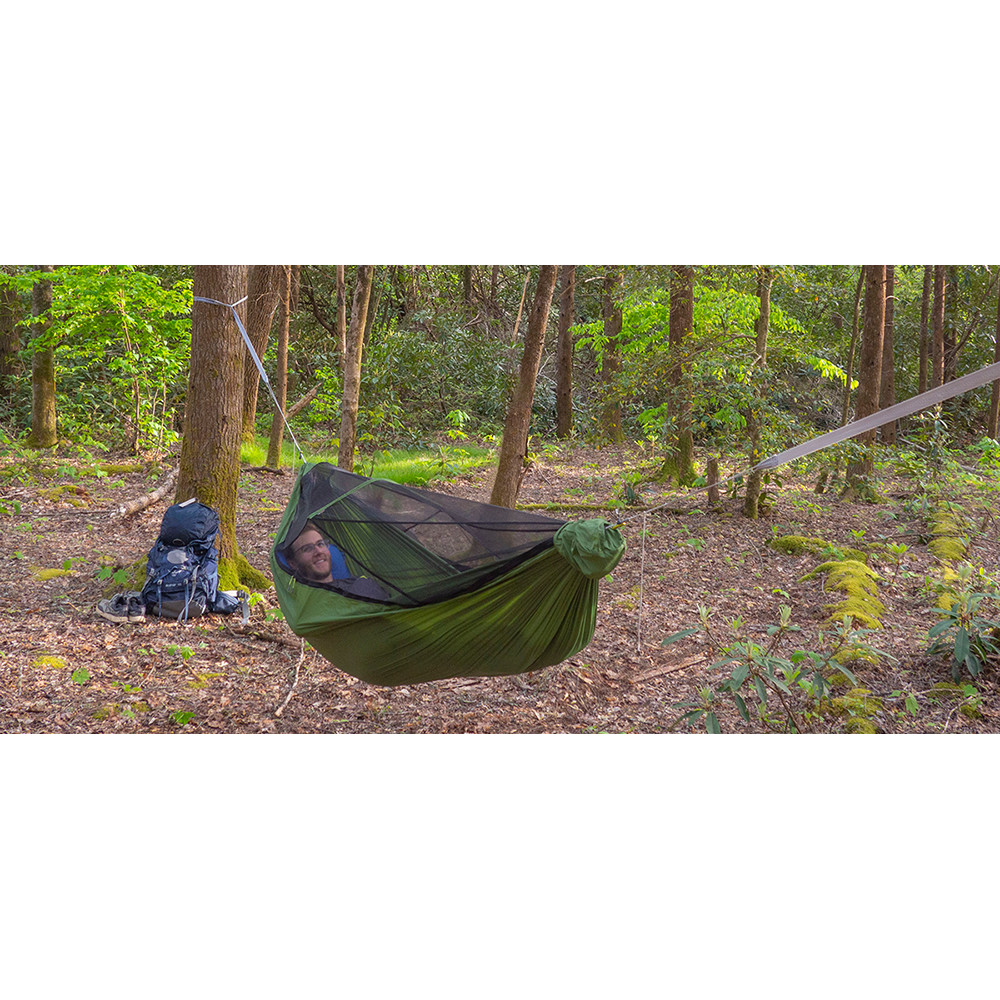 Wydłużona długość pozwala na znalezienie wygodnej, prostej pozycji podczas leżenia po przekątnej. Zintegrowaną moskitierę zapewniającą niezakłócony sen można całkowicie rozpiąć i schować w pokrowcu transportowym. Wbudowane wzmocnienia w moskitierze zwiększają przestrzeń wewnętrzną, podobnie jak w namiocie. Wszystko to w kompaktowej obudowie ważącej pół litra.