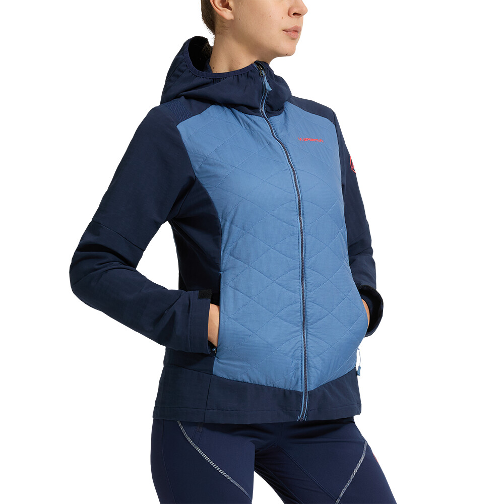 Damska kurtka KAP HYBRID HOODY marki La Sportiva chroni w zimne dni, a jednocześnie jest przyjazna dla środowiska.