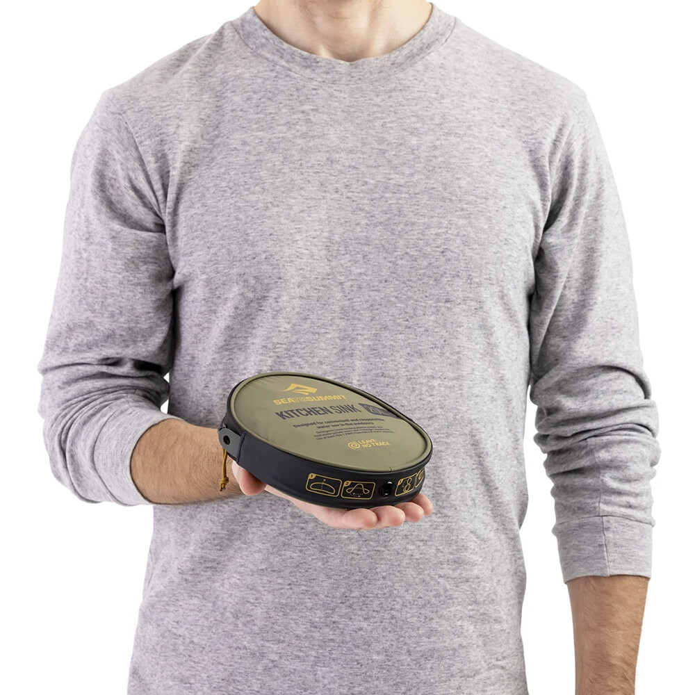 Ultralekki składany zlew do mycia naczyń o pojemności 10 l. Jest wolnostojący ze wzmocnioną górną krawędzią. Jego zaletą jest możliwość złożenia do pojemnika wielkości dłoni. Posiada dwa uchwyty ułatwiające przenoszenie.