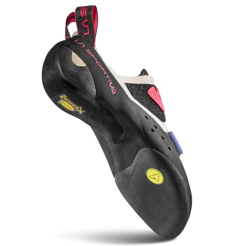 Damskie buty wspinaczkowe z gamy La Sportiva, które zostały innowacyjnie zaprojektowane i umożliwiają zdrowe wspinanie się na palce, zapewniając jednocześnie dobrą wydajność.