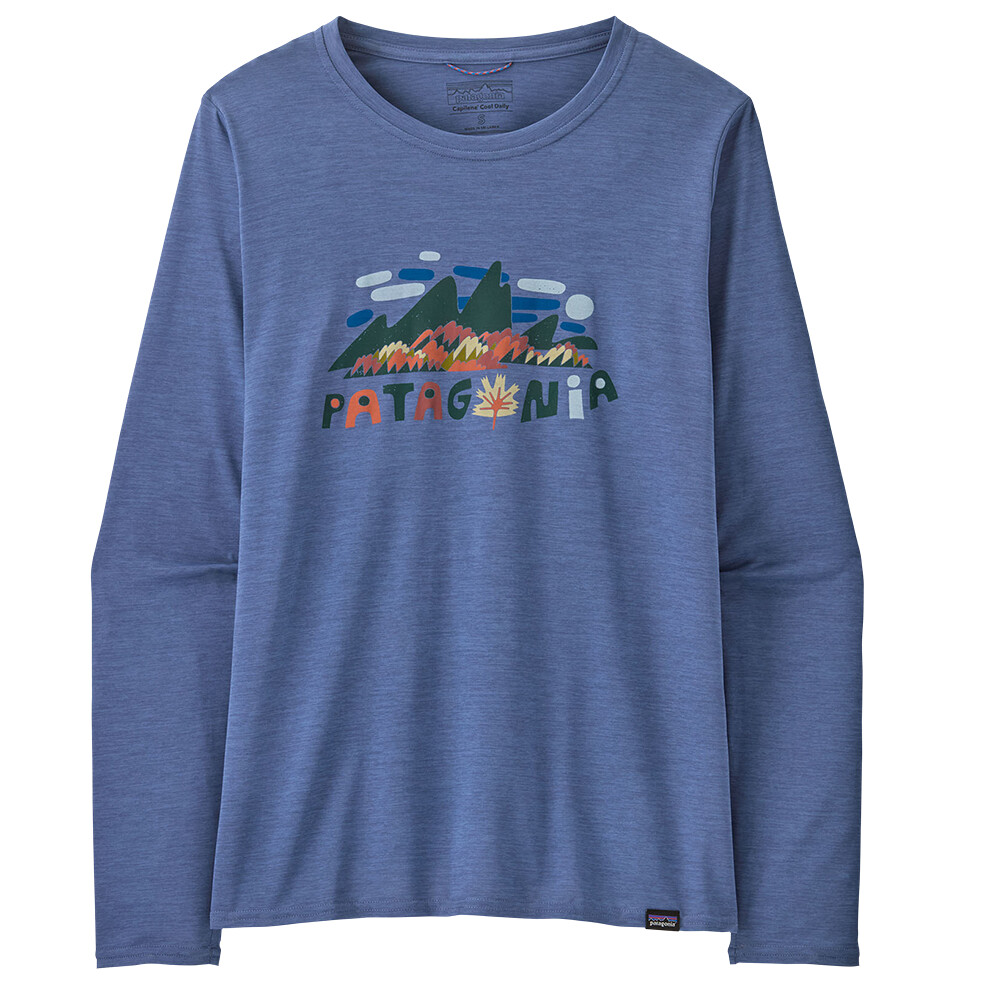 Damska funkcjonalna koszulka L/S Cap Cool Daily Graphic amerykańskiej marki Patagonia. Wykonana została z syntetycznego materiału pochodzącego z recyklingu. Można ją nosić do biegania, jazdy na nartach czy pieszych wędrówek. Koszulka bardzo szybko schnie i pozostaje bezwonna dzięki specjalnej obróbce HeiQ® Fresh.